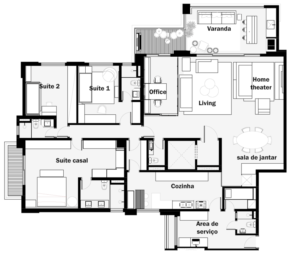 Projeto de Interiores para áreas sociais e íntimas.