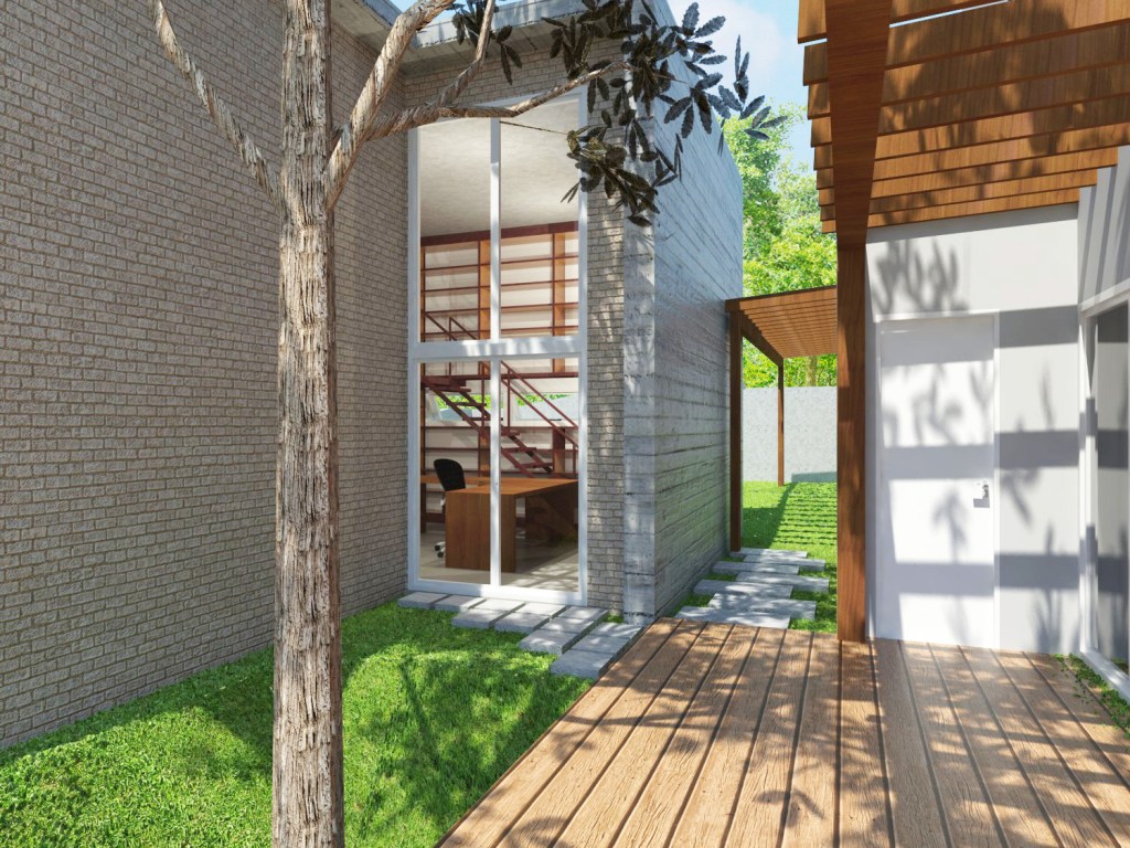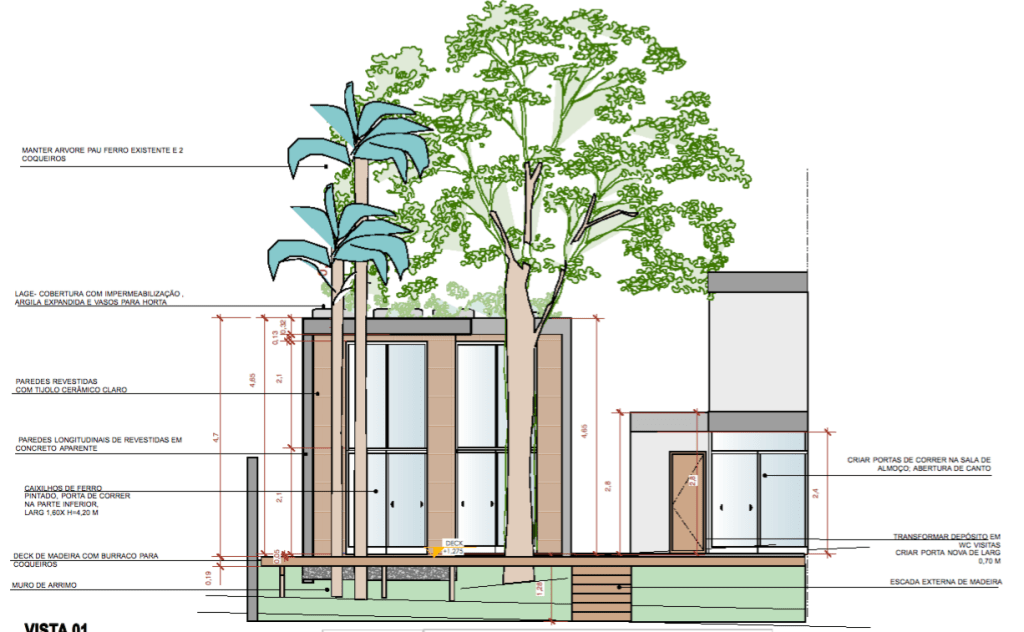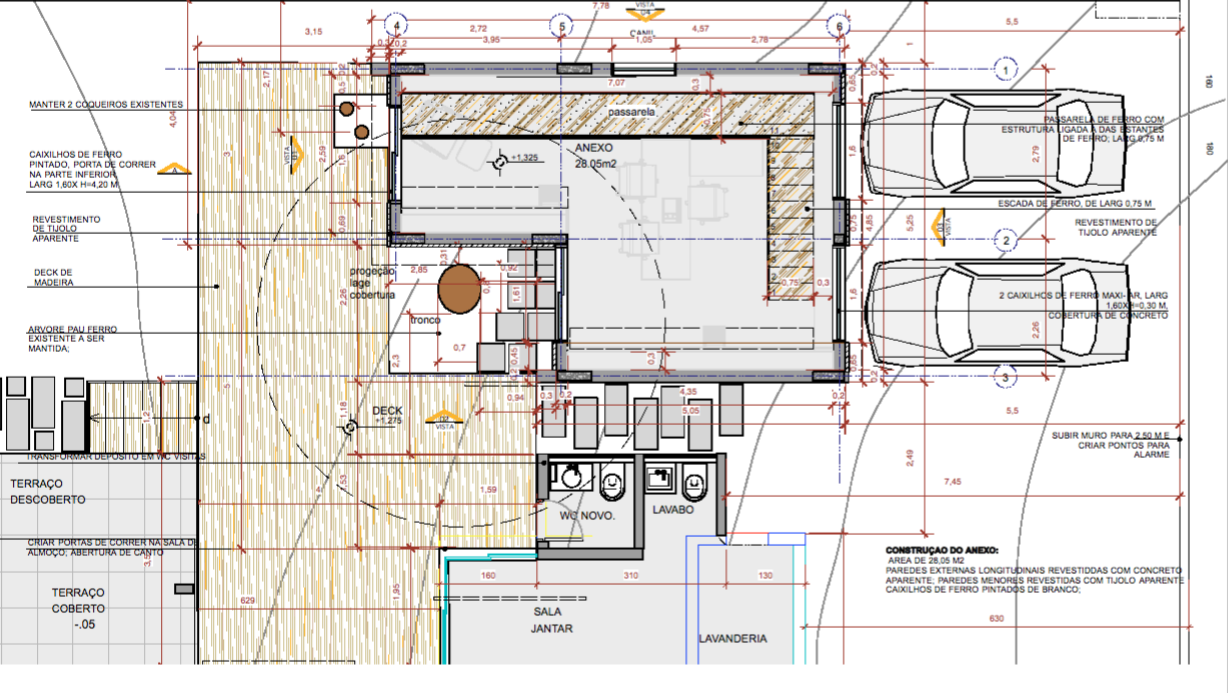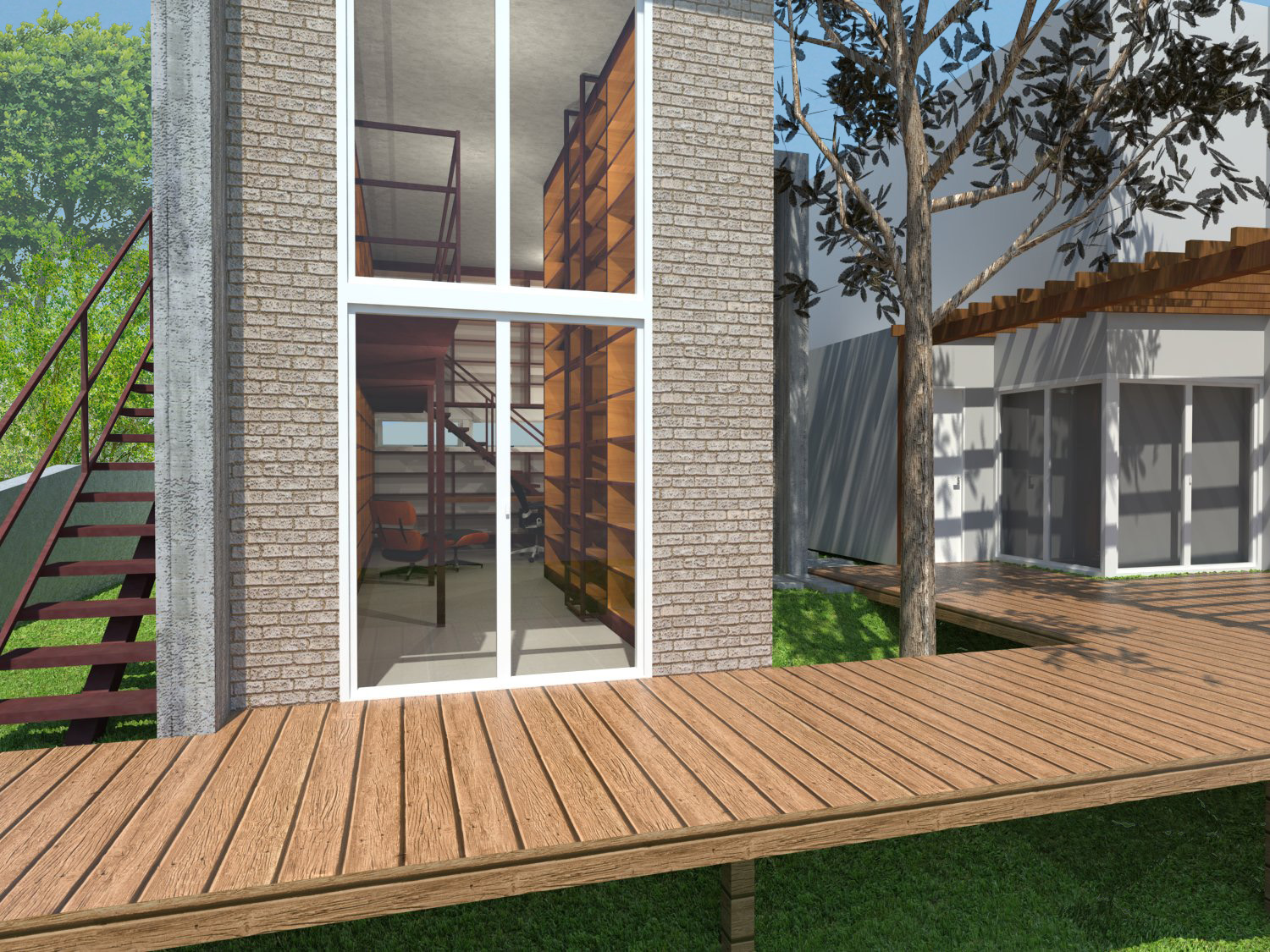 O anexo foi projetado para abrigar os 6000,00 livros do morador, um leitor contumaz; como não podiamos eliminar nenhuma árvore, resolvemos que o volume abraçaria estas e tiraria partido do pé direito alto com a bela vista para o jardim já consolidado da residência.