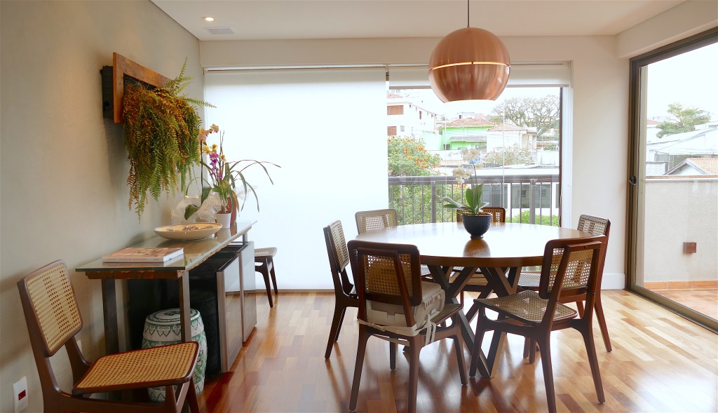 Neste confortável apartamento com varanda privilegiada, os moradores fizeram questão de aproveitar ao máximo a área social, criando aberturas para a varanda gourmet; foram utilizados materiais como piso de madeira, acabamento cimentício nas paredes; a marcenaria foi feita sob medida para dormitórios, closet, home tv e portas.