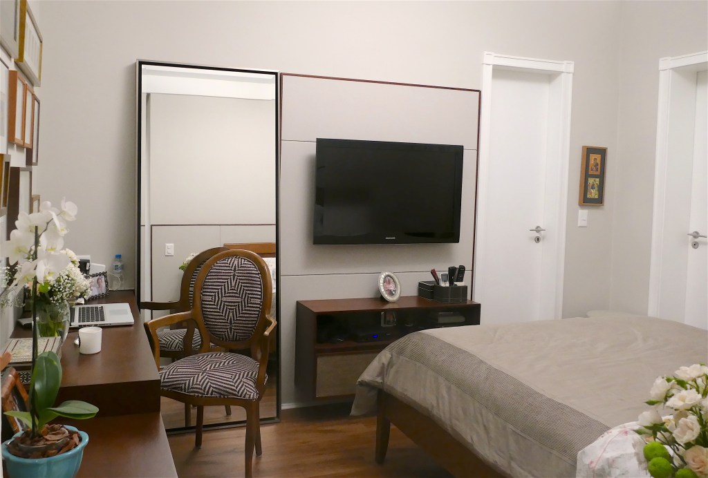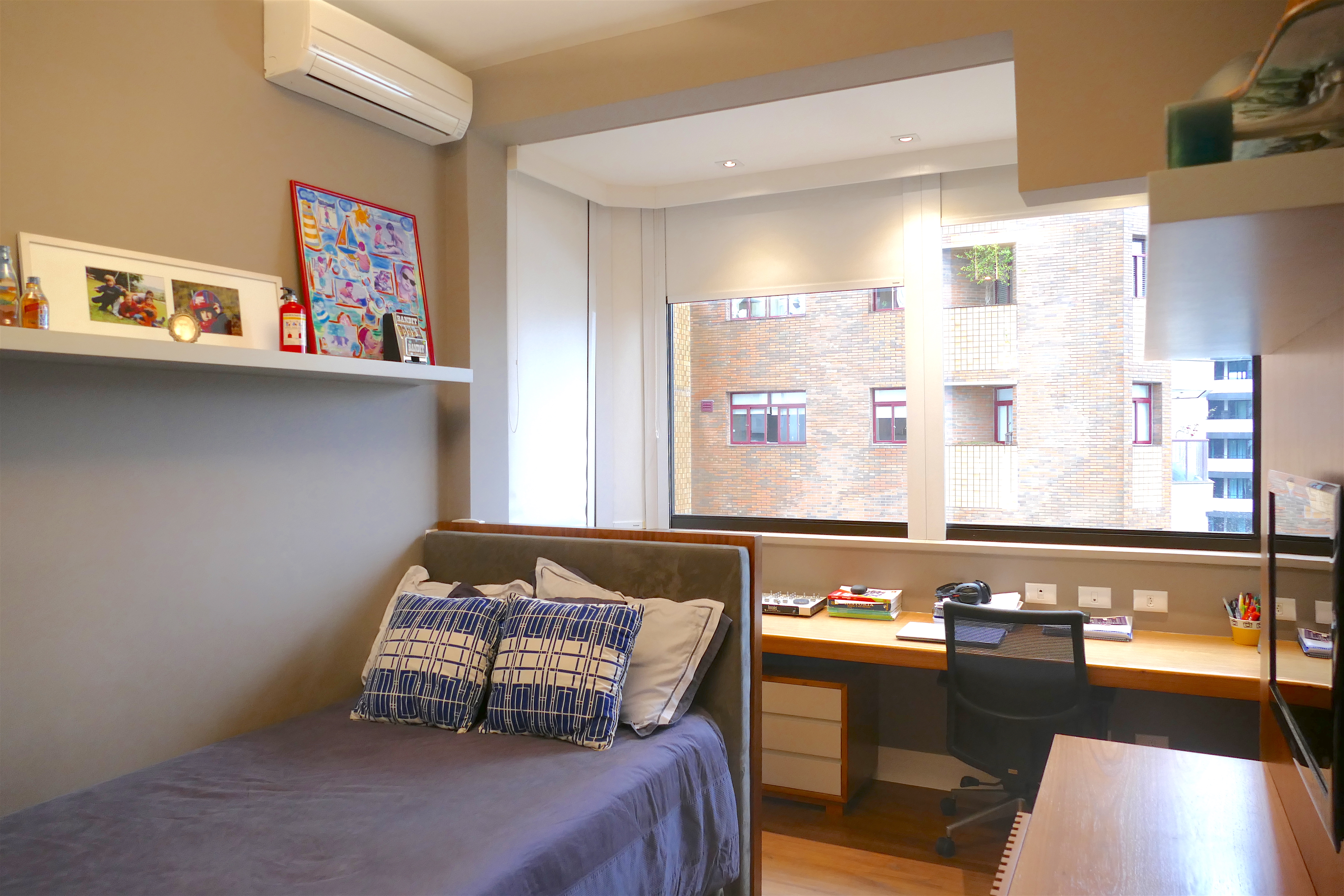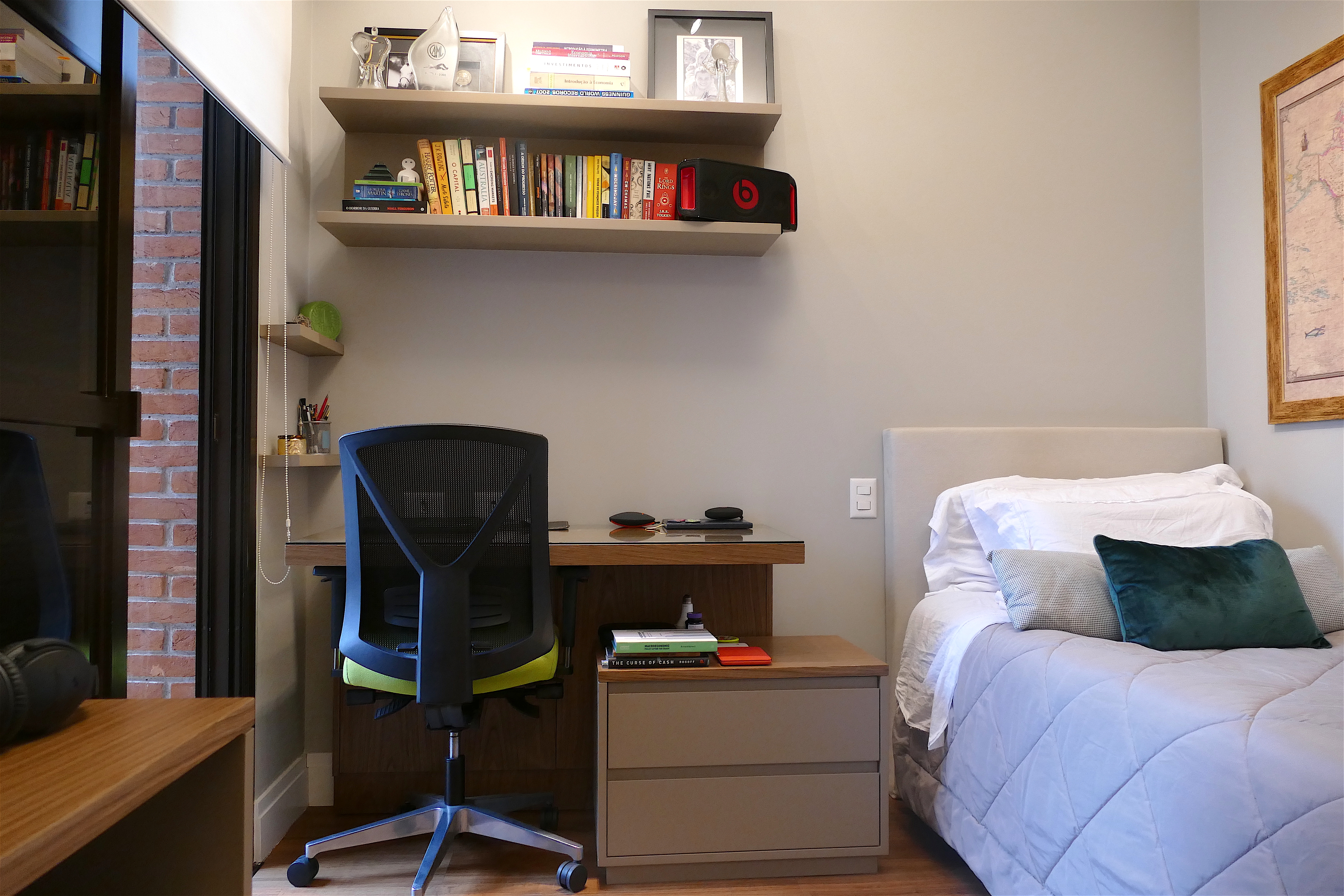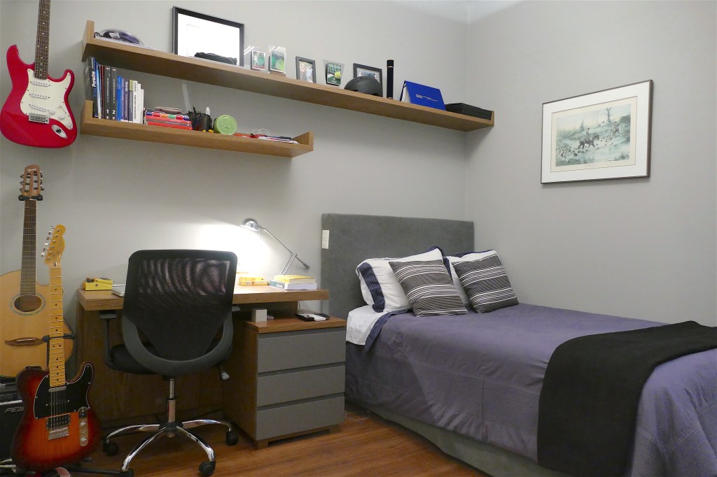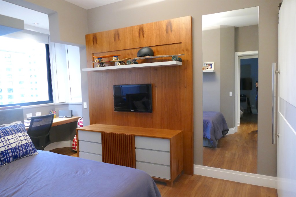 Cada quarto foi adequado refletindo o estilo da morador; um é apaixonado por viagens, o outro por música, esportes ou artes. O living ganhou mobília complementar e uma magnífica tela do artista Sérgio Lucena .