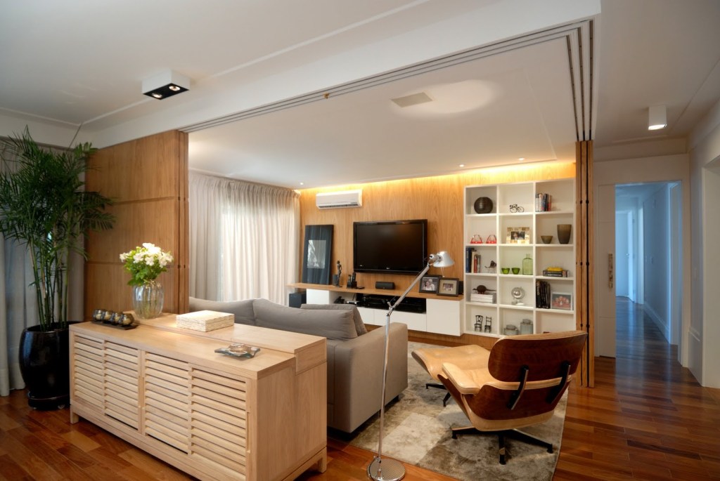 O partido para área social foi integrar visualmente os espaços do Living, Home Theater e Sala de Jantar. Eventualmente com a possibilidade de isolar a sala de TV através de grandes portas de correr revestidas em freijó lavado.