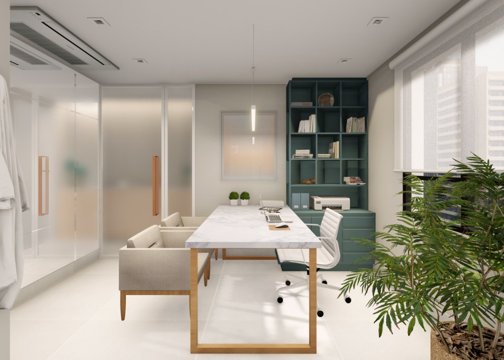 Buscamos neste projeto de clínica dermatológica, criar espaços funcionais e confortáveis, utilizando tons claros e materiais de fácil manutenção, sem perder sofisticação.