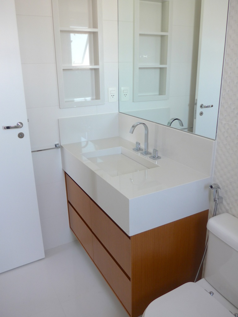 Outro fator essencial em qualquer banheiro ou lavabo é o espaço de armazenamento, que normalmente se encontra embaixo da pia, nos gabinetes, porém é possível se utilizarem nichos, prateleiras ou armários acima da pia, revestidos com espelhos para aumentar a sensação de amplitude no local.