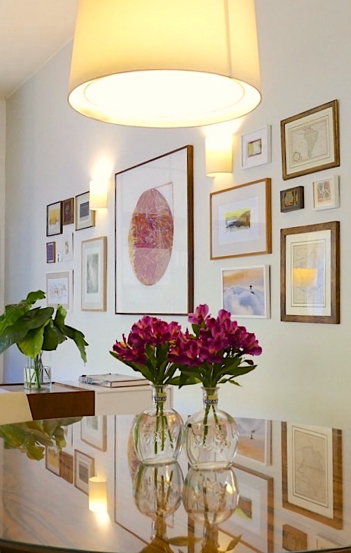 A realidade é que existem inúmeras formas de montar essa composição, seja de quadros monocromáticos, ótimo para quem prefere a estética minimalista; combinada com a decoração, usando a mesma paleta de cores e se misturando ao ambiente; botânica, com tema natural dentro de casa e está em alta; na estante, com quadros apoiados para quem não quer fazer tantos furos nas paredes; com sobreposições, batendo alguns pregos na parede e amarrando barbantes em diversas alturas, cria diferentes profundidades; de jeitos diferentes na mesma parede; com vários elementos, combinando pinturas, fotografias, neons, skates e bicicletas, etc; gallery wall, com paredes completamente tomadas por obras; com bordas grudadas, dando uma sensação de fluidez e seqüência; quadro imaginário, deixando todos os quadros dispostos de forma com que pareçam formar um quadro só; enfim, as possibilidades são enormes, basta usar a criatividade.