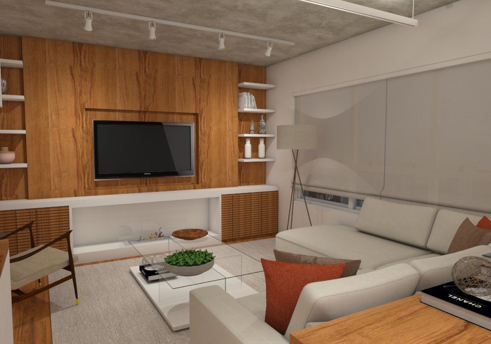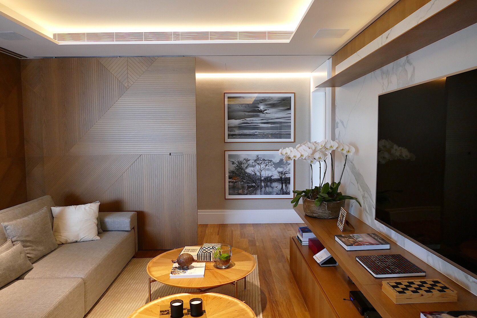 Com tantos sistemas de som e imagem, é interessante criar um sistema em que seja possível ocultar toda a fiação, como painéis de madeira e nichos, que também podem servir de espaço para apoiar equipamentos e objetos.