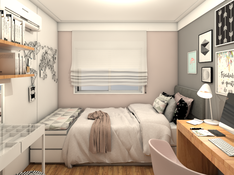 Meninas adoram receber suas amigas para bate papos e sessões de escolha de look para festas, assim, a cama tem que ser confortável e cheia de almofadas; as camas de dimensões mais largadas de 1,30m têm sido super requisitadas. Luminárias articuladas para leitura são bem vindas, assim como abajures com mobilidade em cima de criados mudos.