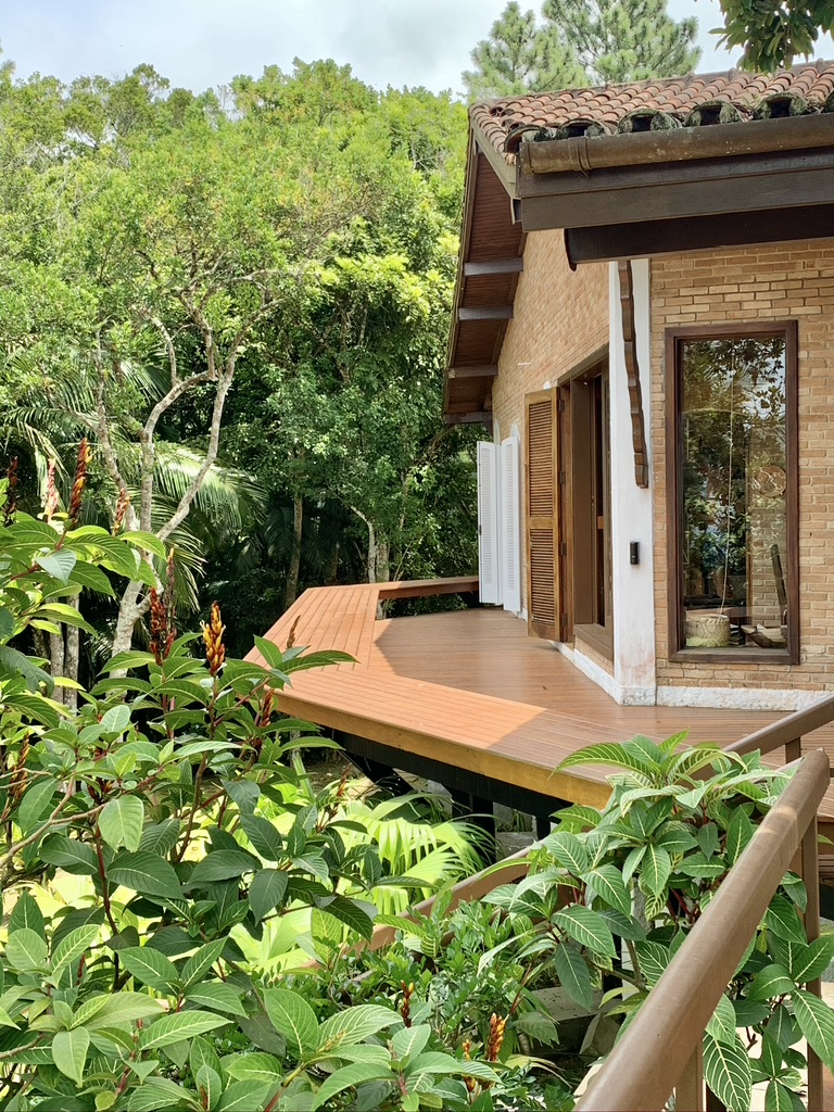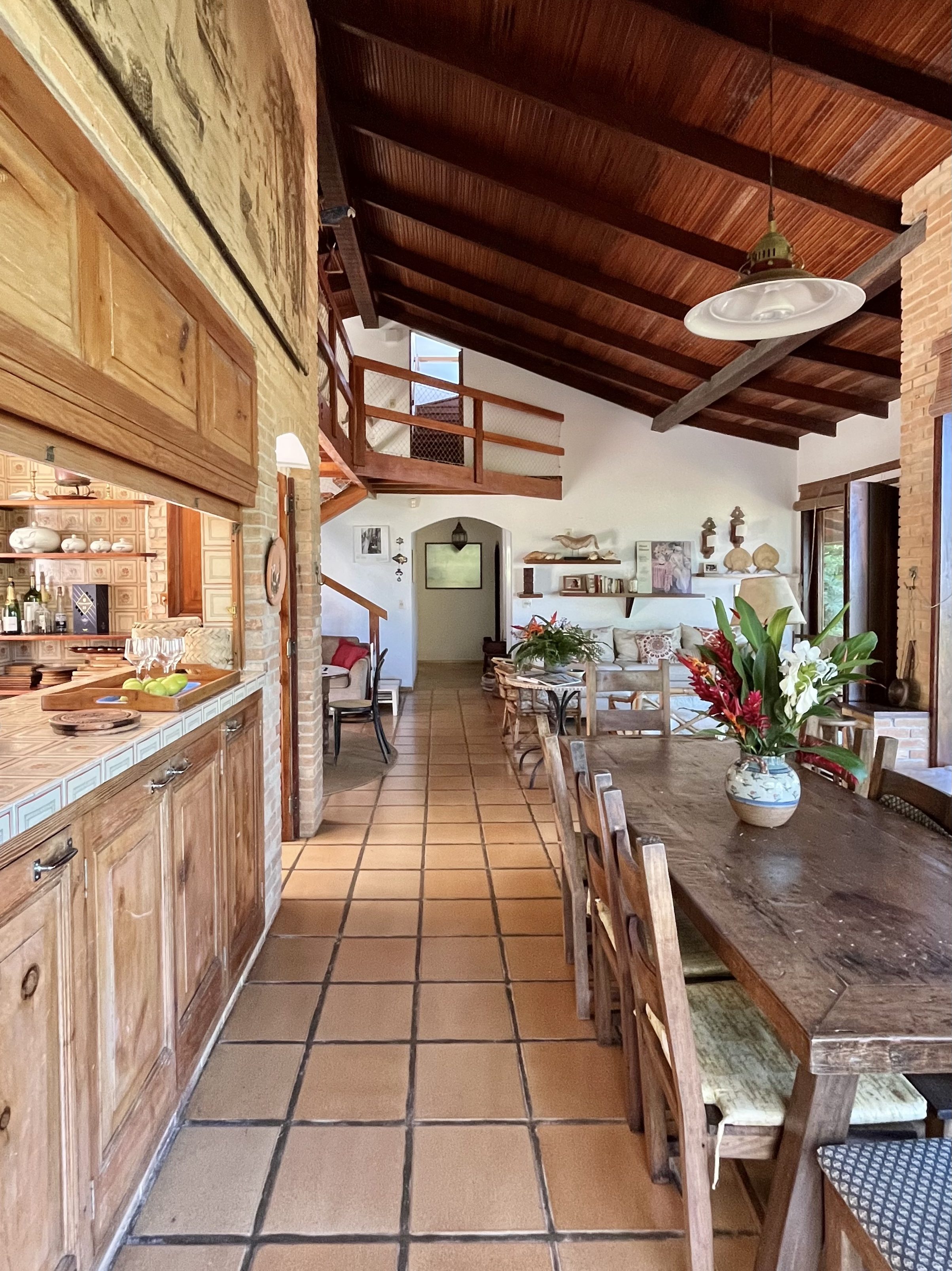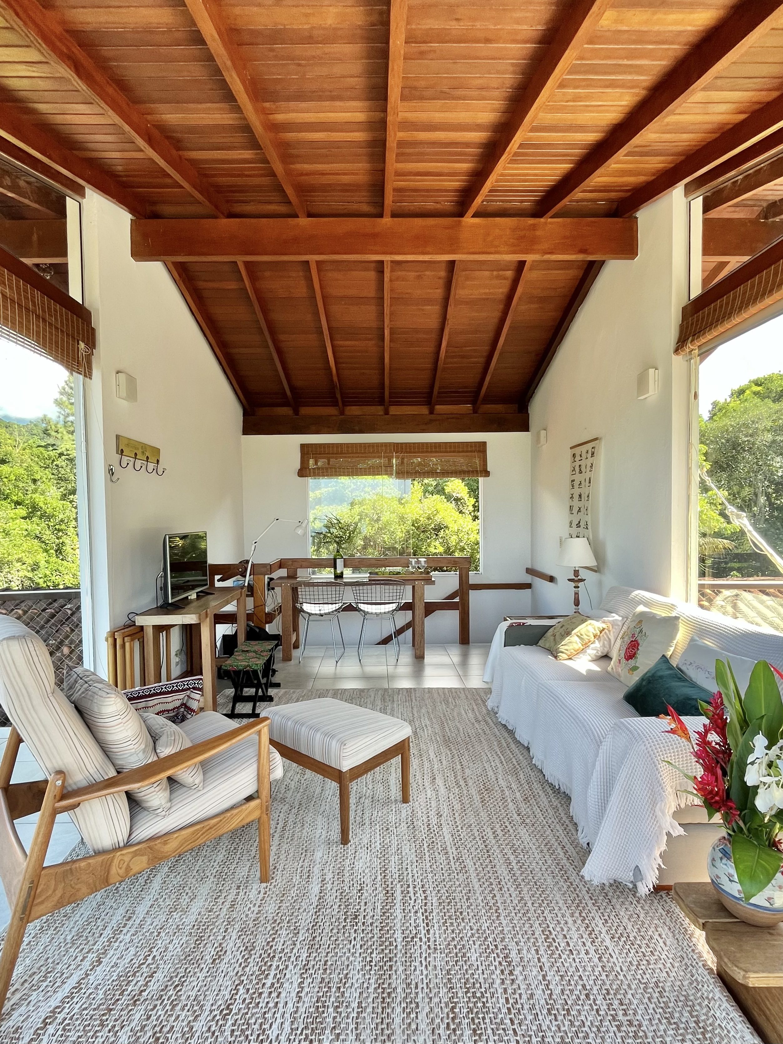 englobando a varanda o living e o home theater. A sala de jantar recebeu uma vista para um belo muro verde.