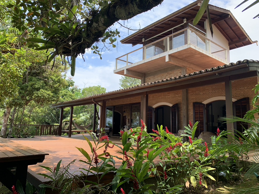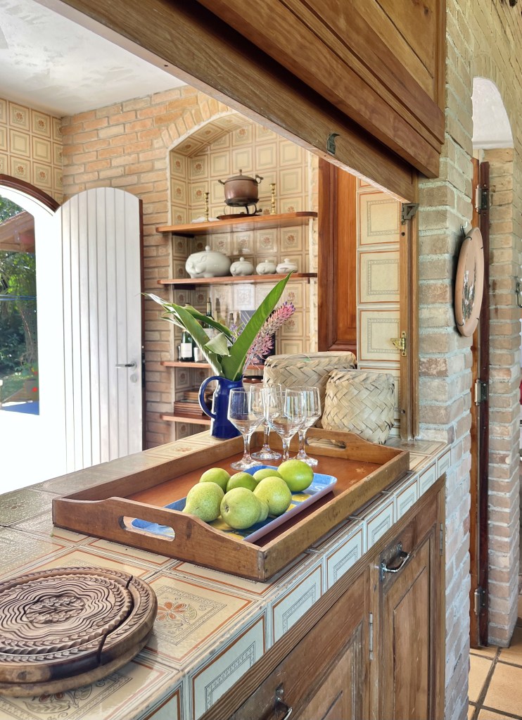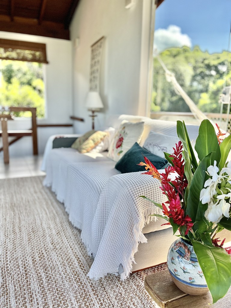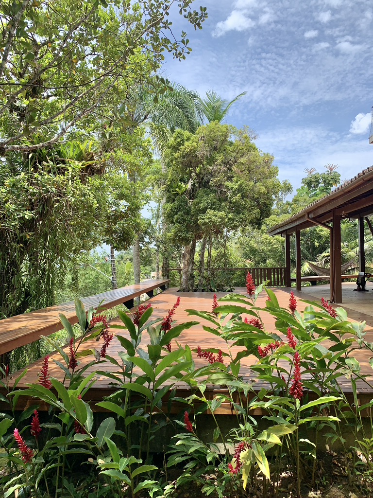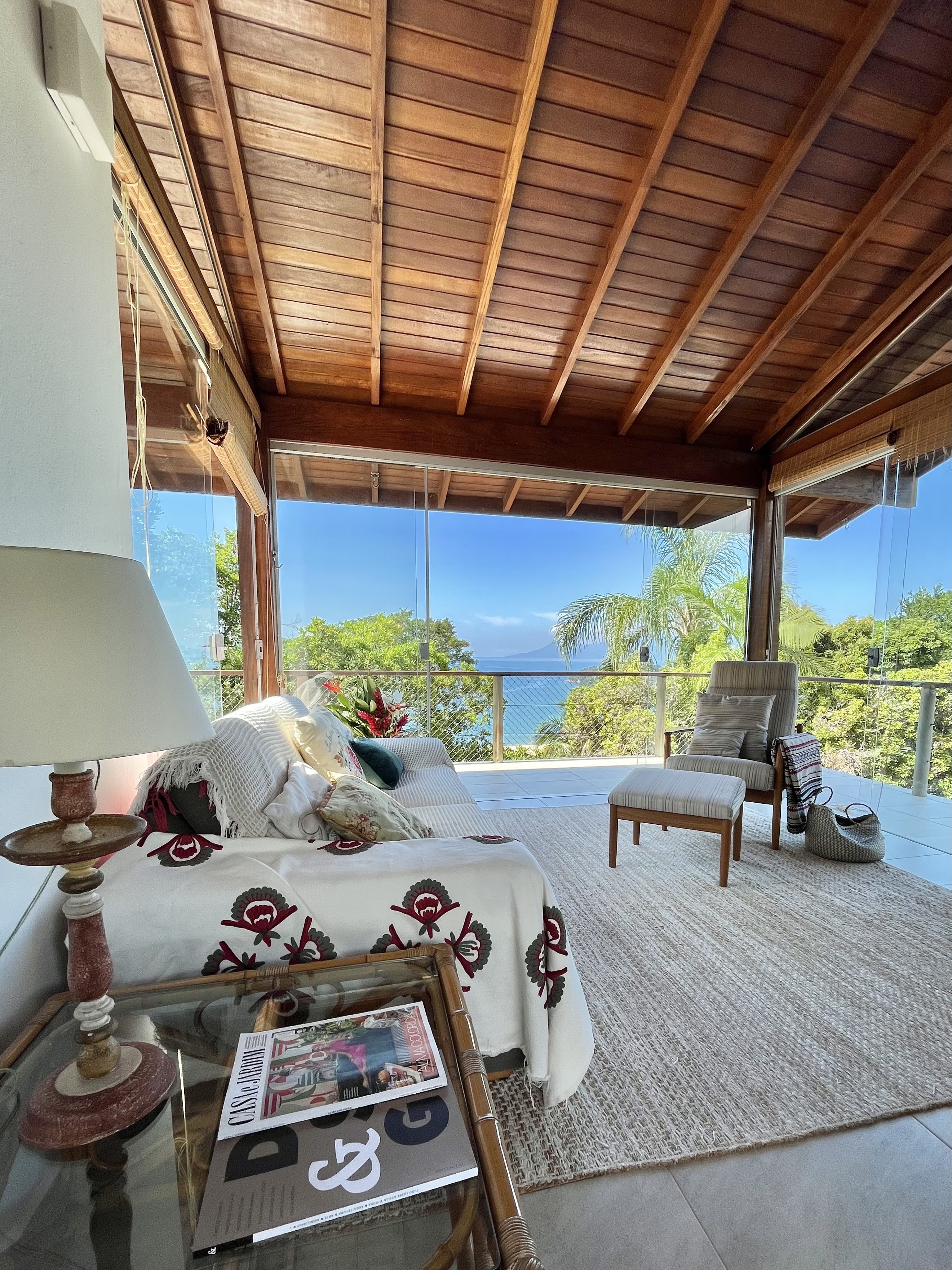 englobando a varanda o living e o home theater. A sala de jantar recebeu uma vista para um belo muro verde.