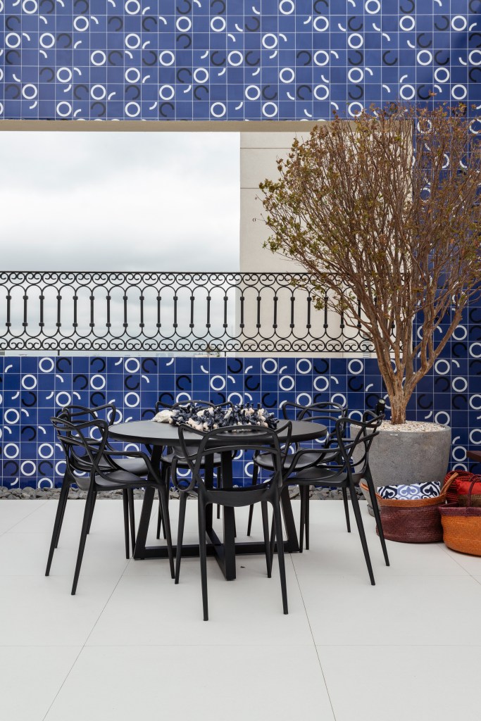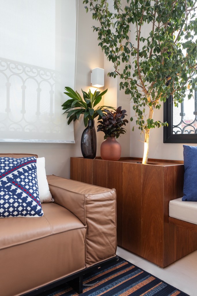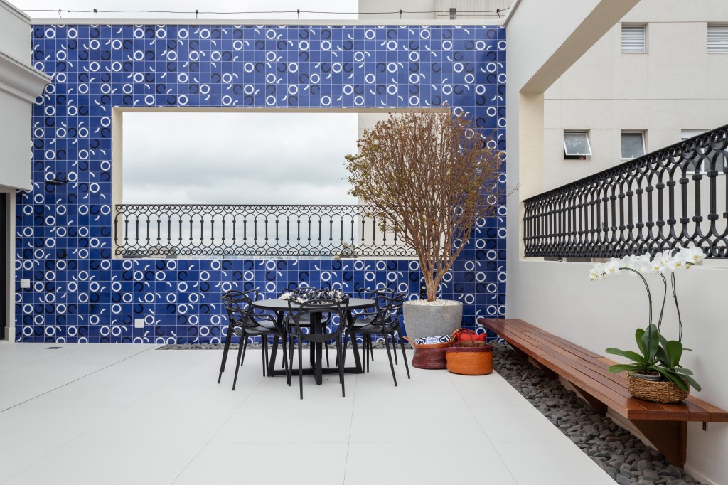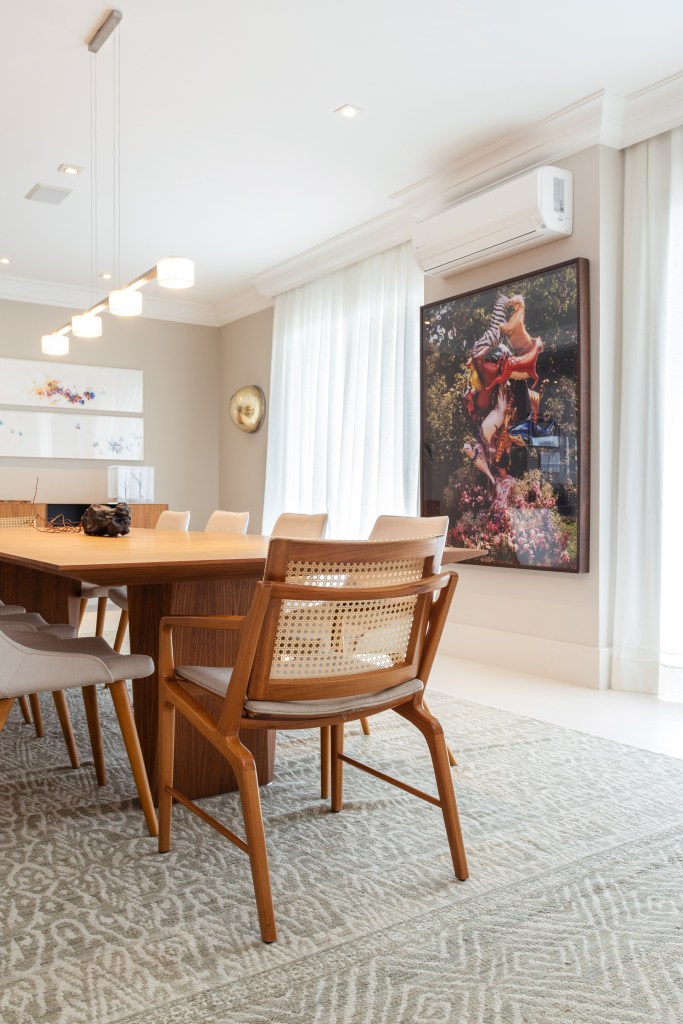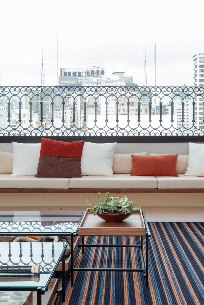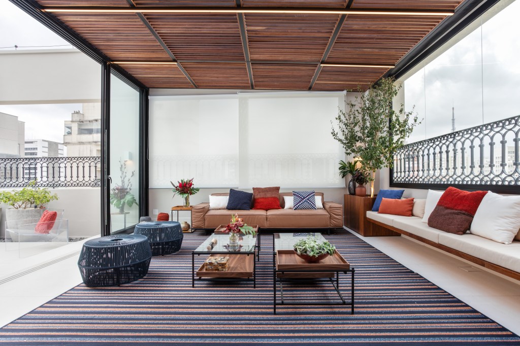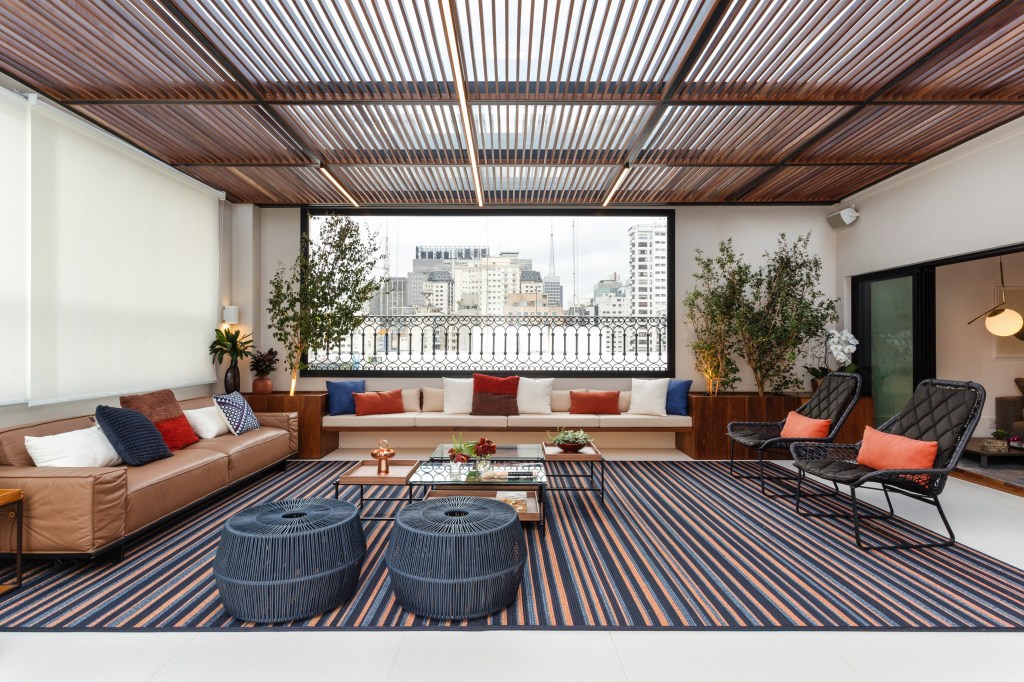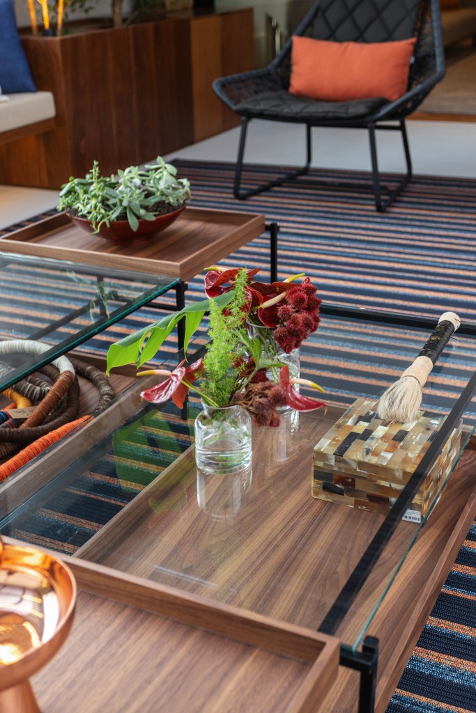 O mobiliário foi cuidadosamente selecionado para criar um ambiente convidativo, perfeito para relaxar e desfrutar da vista para o paisagismo de Tetê Geribello. Um confortável sofá de couro da Ovoo, cadeiras e puff de corda da Franccino Casa, e um banco de madeira com almofadas foram escolhidos para proporcionar conforto e estilo. Duas mesas de centro de ferro da Estar Móveis e um tapete listrado de corda da Tidelli complementaram o conjunto, dando um toque de sofisticação e aconchego.