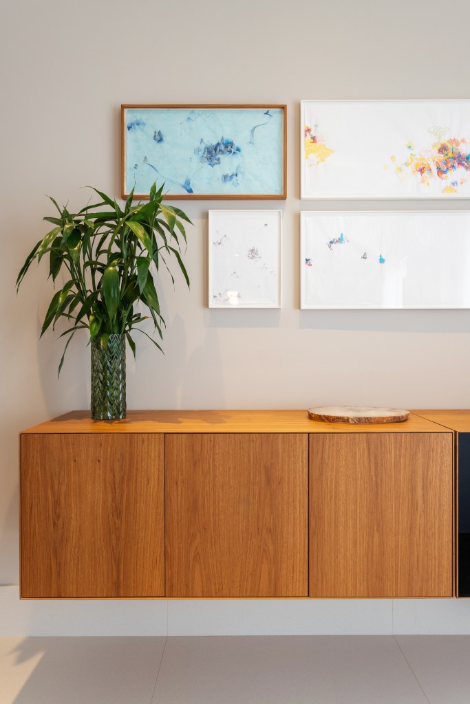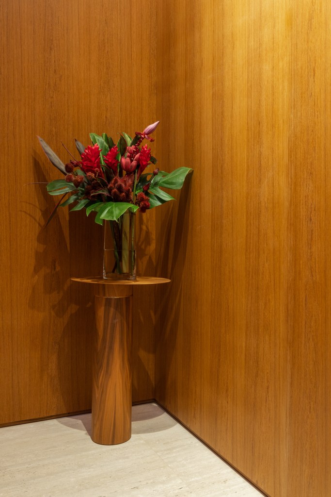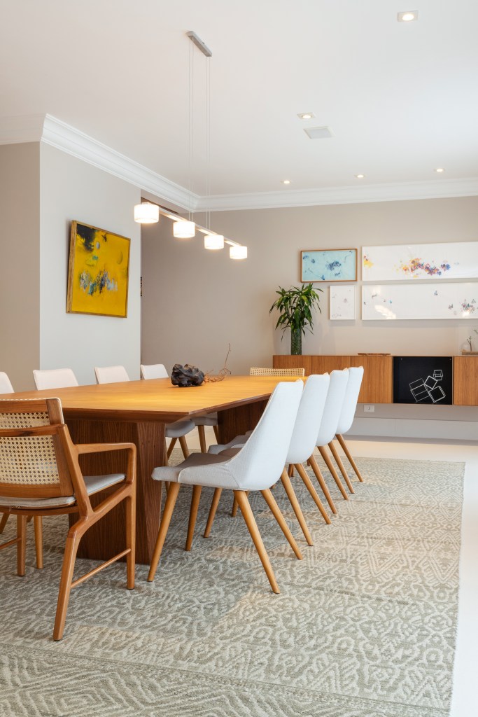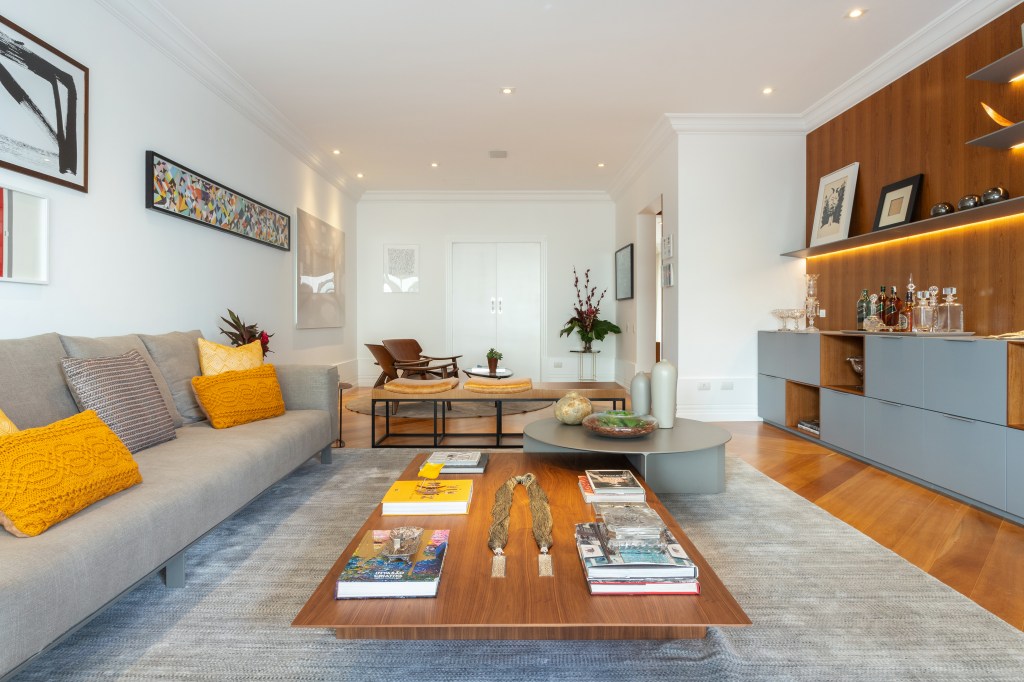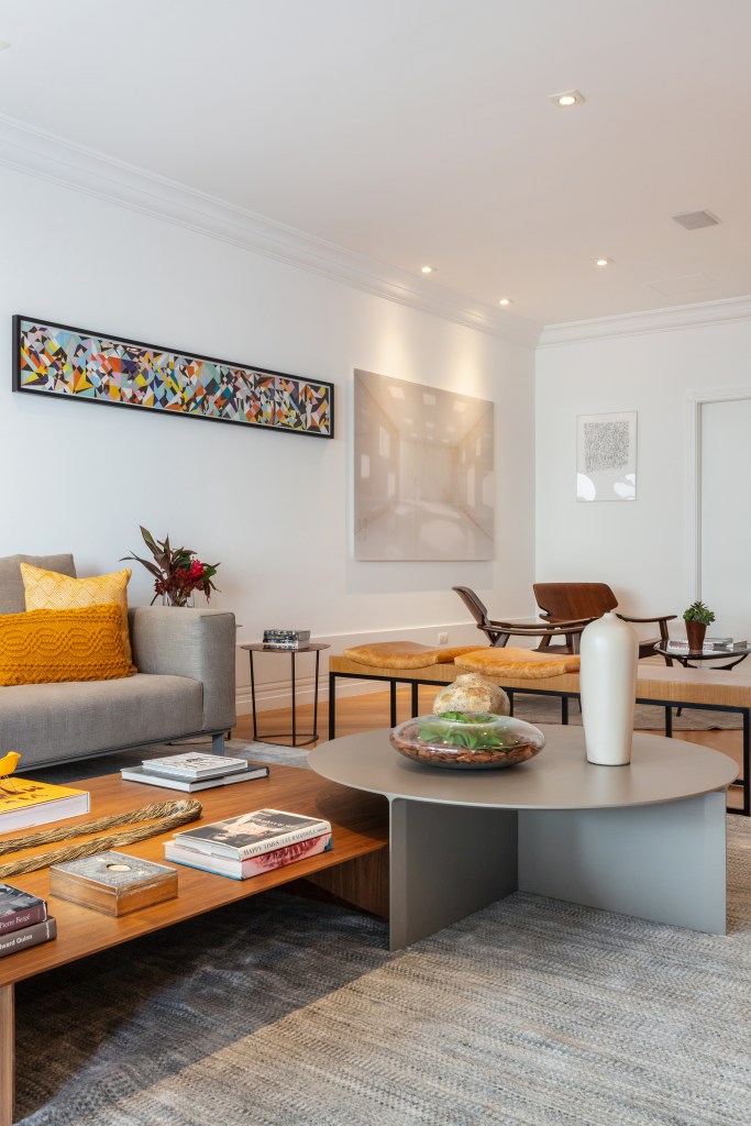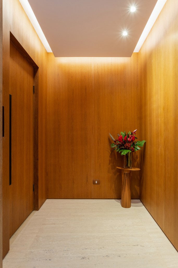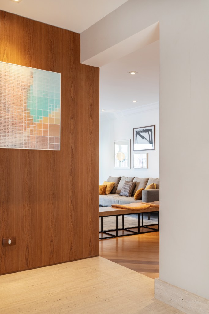 Para o living, desenvolvemos uma estante contemporânea em folha de madeira e laca cinza, enquanto o hall do elevador foi completamente reformulado com painéis e forro de madeira iluminado, executados pela marcenaria Avelarte. A ideia era criar um cenário perfeito para destacar a bela coleção de arte dos moradores, que ganhou protagonismo nas paredes do living, da sala de jantar e do hall.
