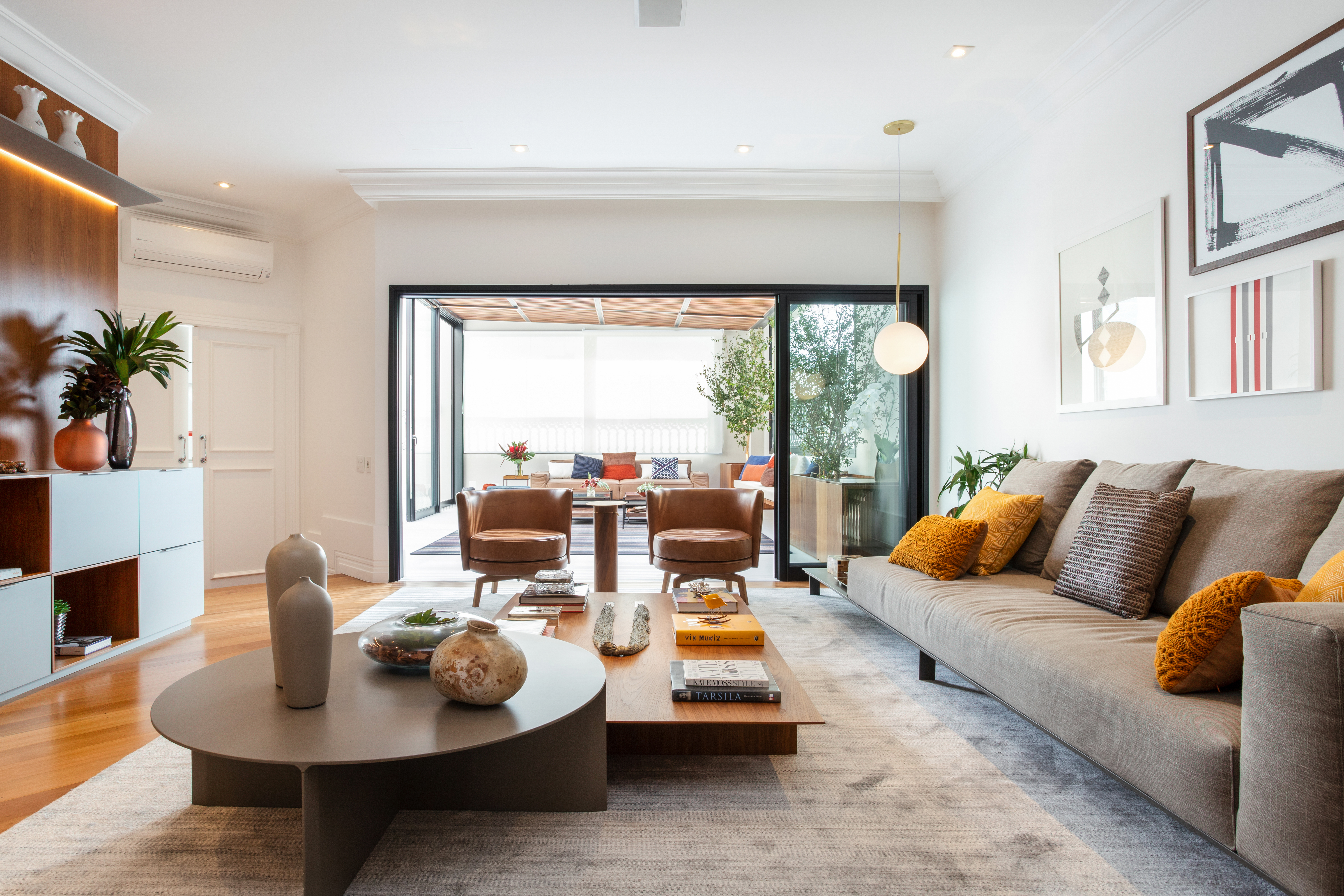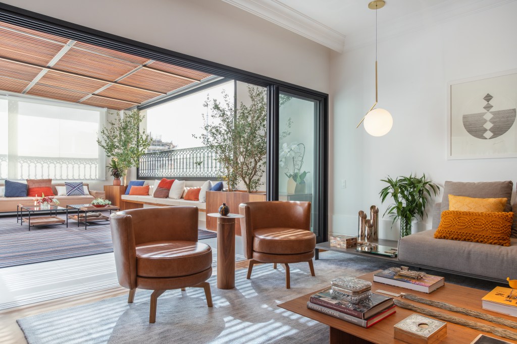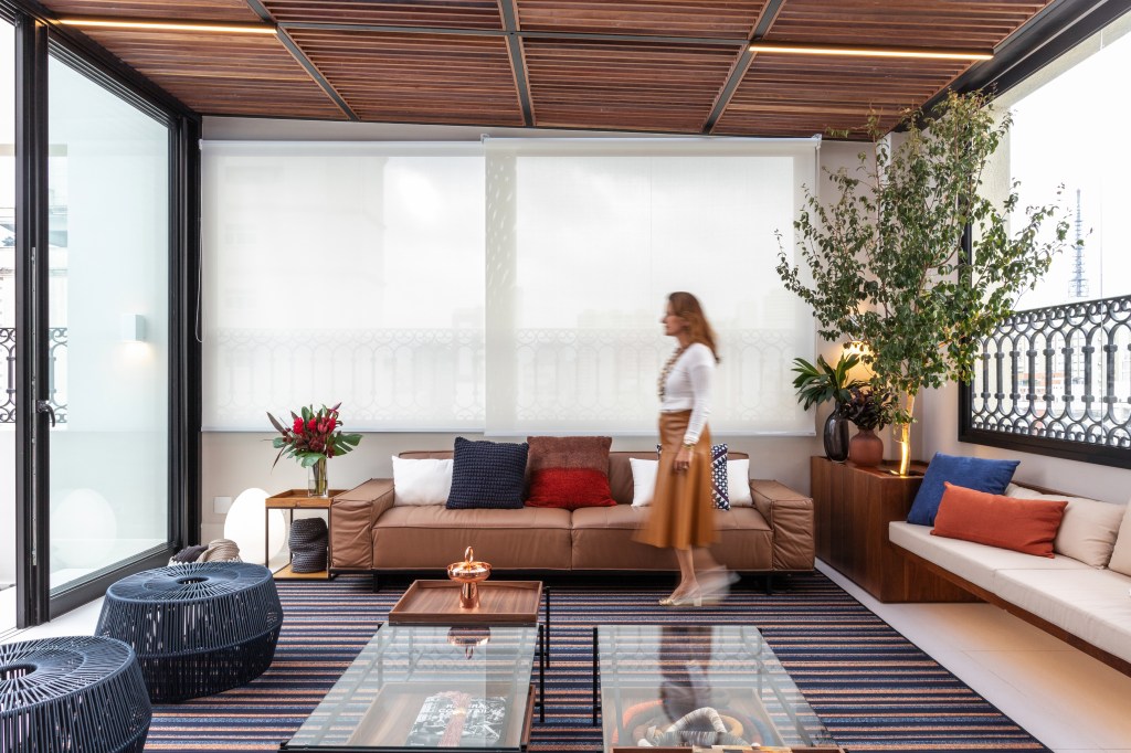 Para este apartamento duplex localizado no coração dos Jardins, o desafio foi criar uma integração perfeita entre a cobertura, a varanda e o living, além da sala de jantar, mantendo a harmonia com o restante do espaço.