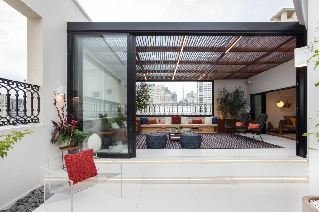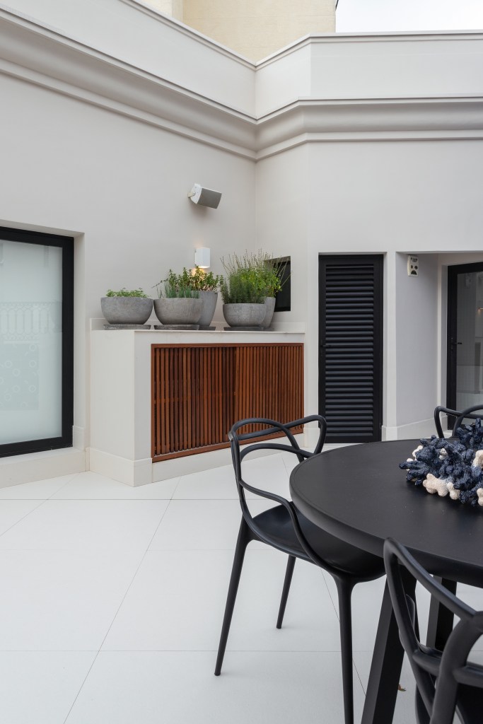 O primeiro passo foi eliminar a piscina com deck elevado, o que exigiu um trabalho de engenharia cuidadoso e uma impermeabilização reforçada. A estrutura de vidro antiga foi removida, dando lugar a um anexo maior, com estrutura de ferro galvanizado, executada pela Serralheria Pires. Grandes portas de correr e uma cobertura de vidro com forro de madeira ripado (Kmmarcenaria) trouxeram leveza e funcionalidade ao ambiente. O piso em porcelanato de grandes formatos da Portobello foi escolhido para garantir continuidade visual entre a área descoberta e o novo espaço.
