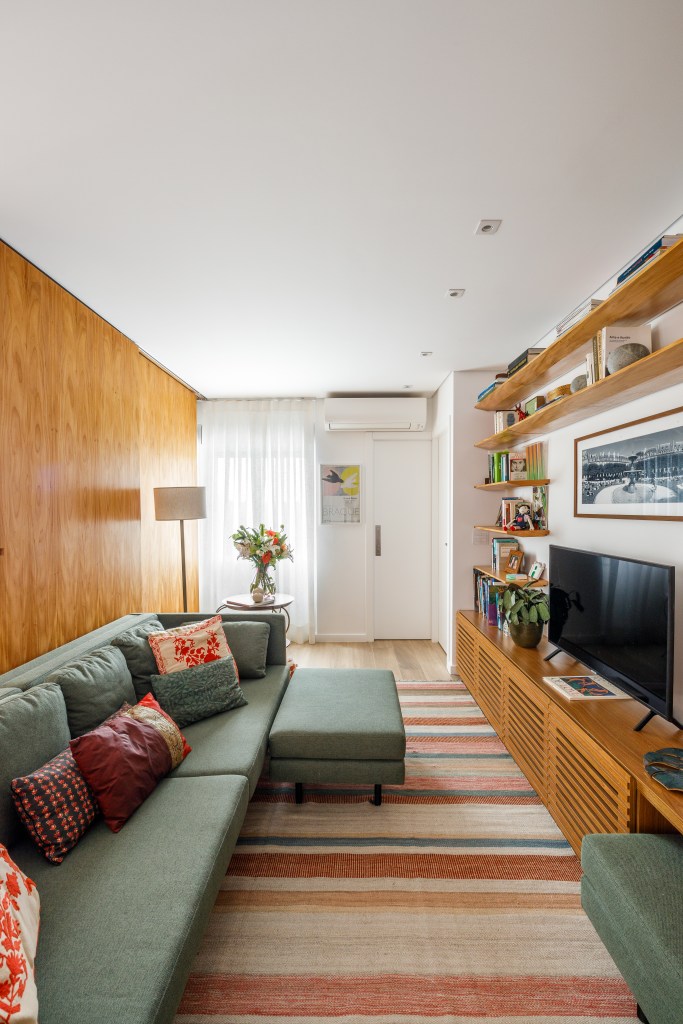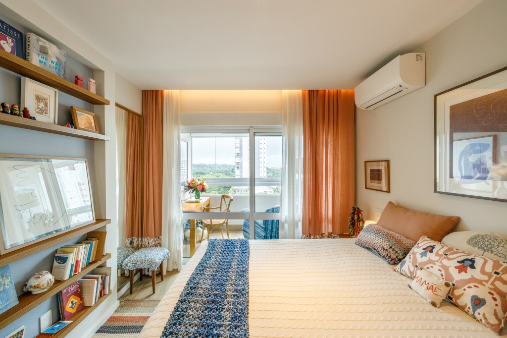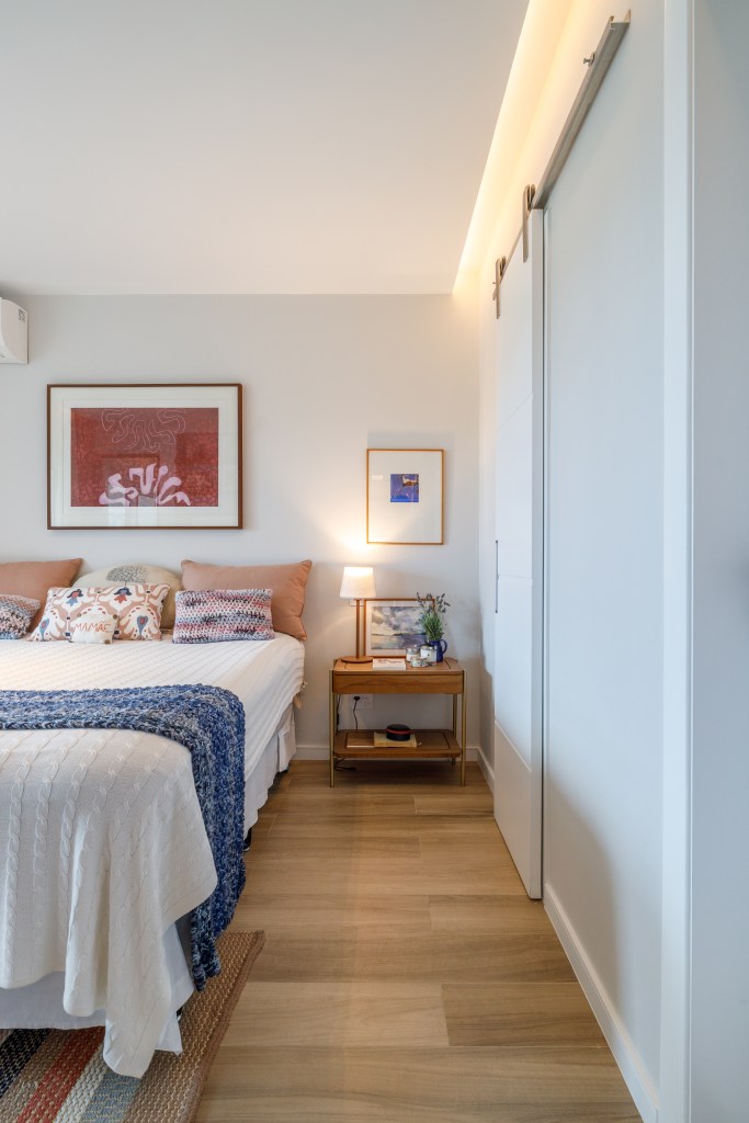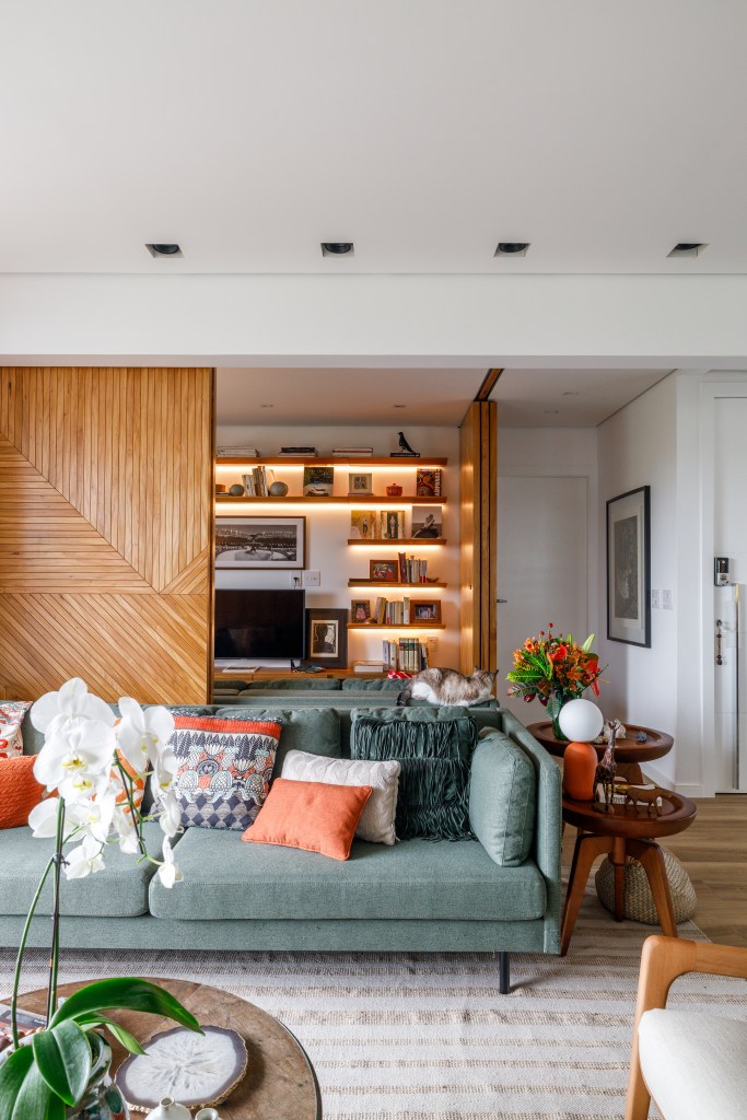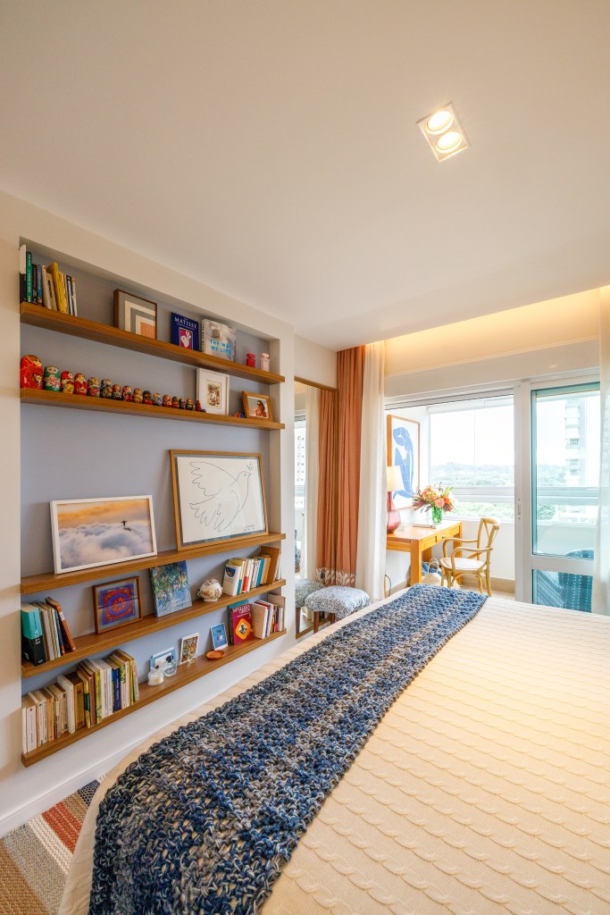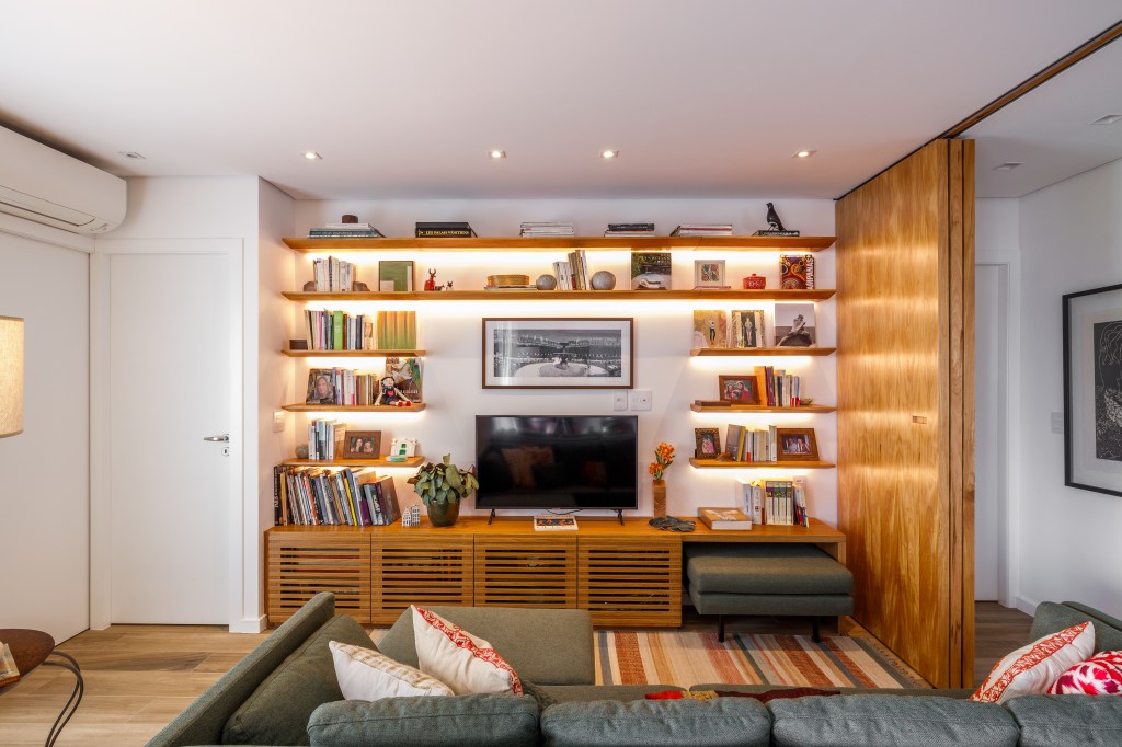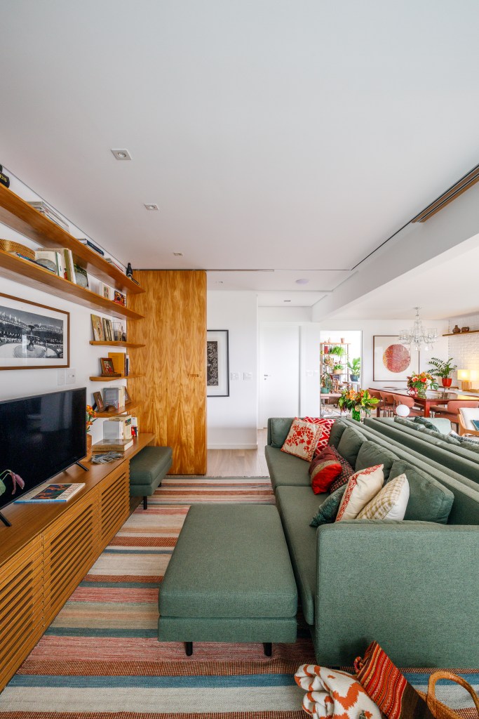 Para solucionar essa questão, parte da sala de estar foi transformada em um quarto confortável e bem iluminado para uma das filhas, uma jovem mulher. A integração desse novo dormitório foi feita com a construção de uma parede de drywall, que garantiu privacidade e uma estética alinhada ao restante do apartamento. Além disso, para otimizar a dinâmica da área social, portas de correr de madeira foram instaladas, permitindo maior privacidade à sala de TV quando necessário, sem interferir na circulação e na integração dos outros espaços sociais.