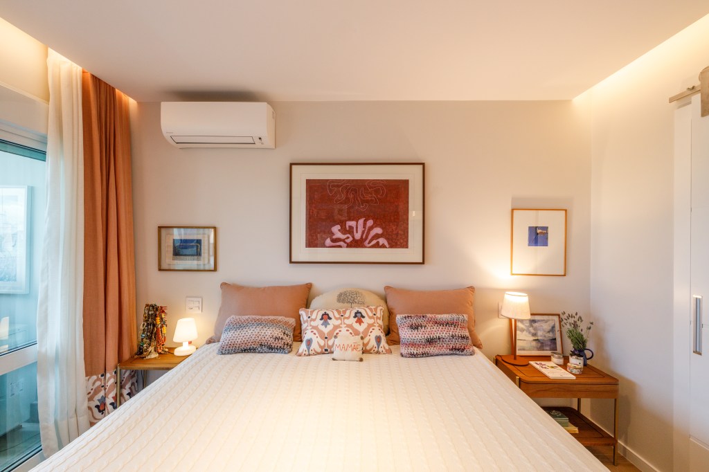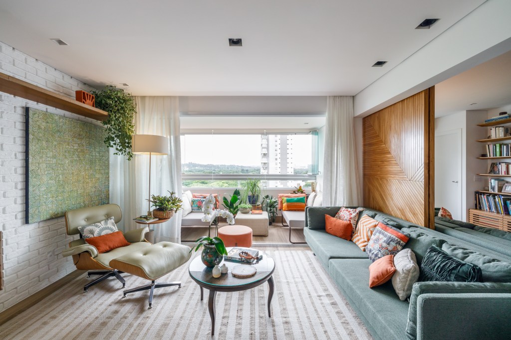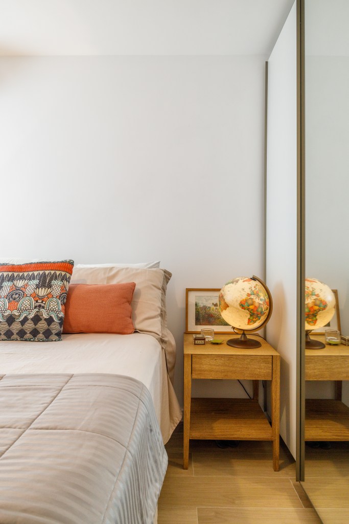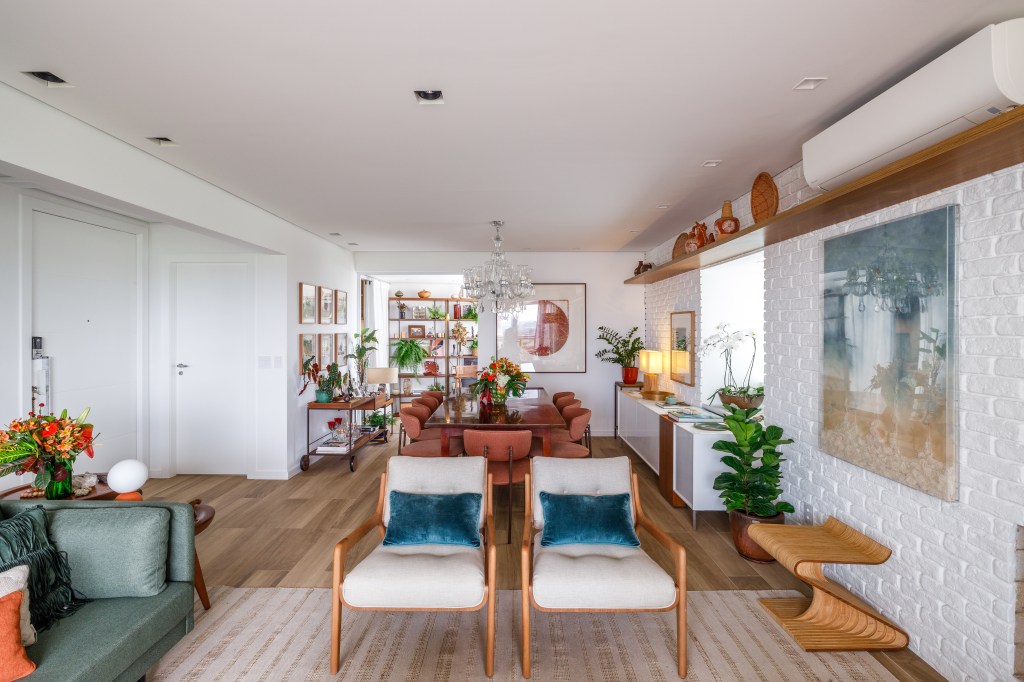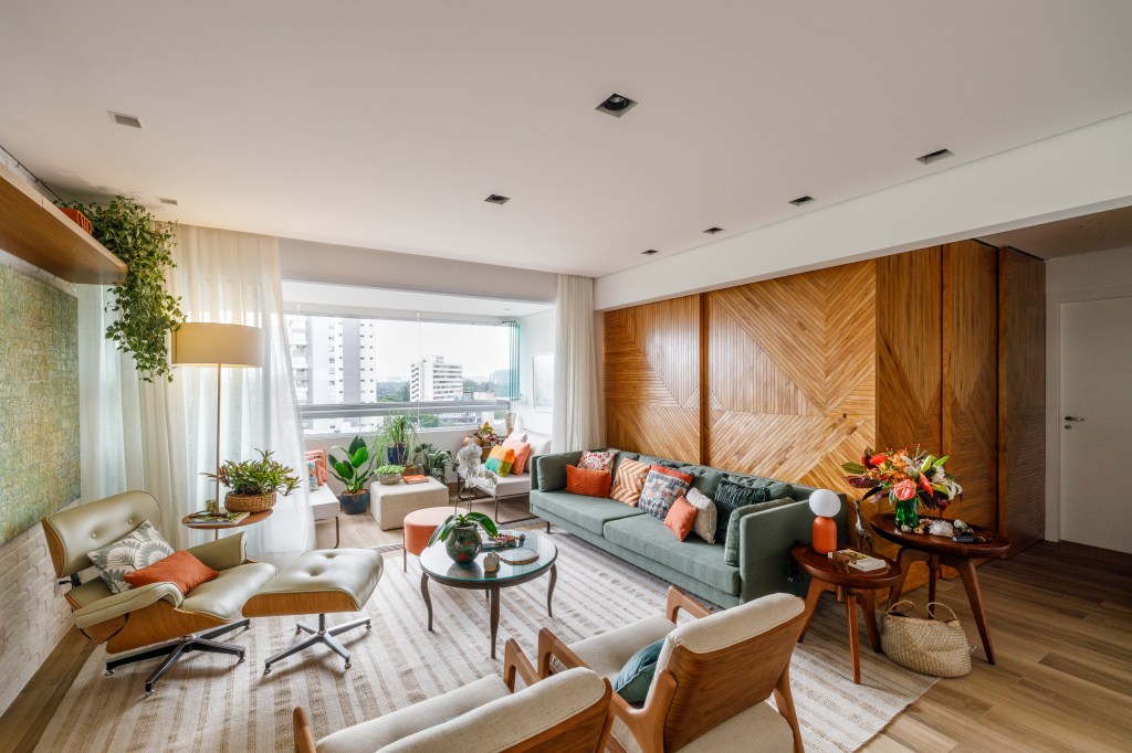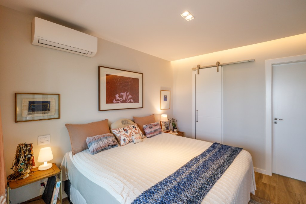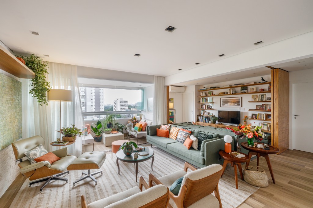 Para solucionar essa questão, parte da sala de estar foi transformada em um quarto confortável e bem iluminado para uma das filhas, uma jovem mulher. A integração desse novo dormitório foi feita com a construção de uma parede de drywall, que garantiu privacidade e uma estética alinhada ao restante do apartamento. Além disso, para otimizar a dinâmica da área social, portas de correr de madeira foram instaladas, permitindo maior privacidade à sala de TV quando necessário, sem interferir na circulação e na integração dos outros espaços sociais.