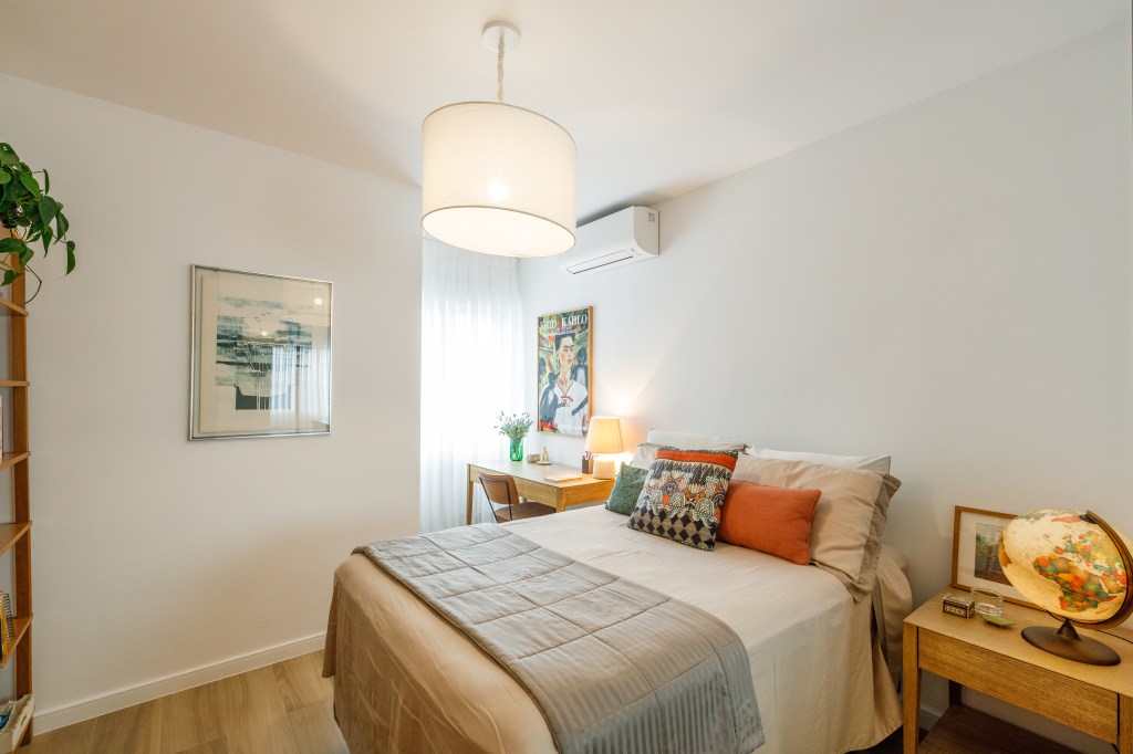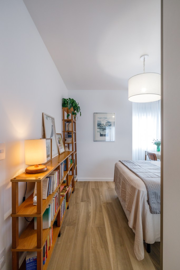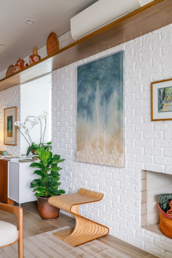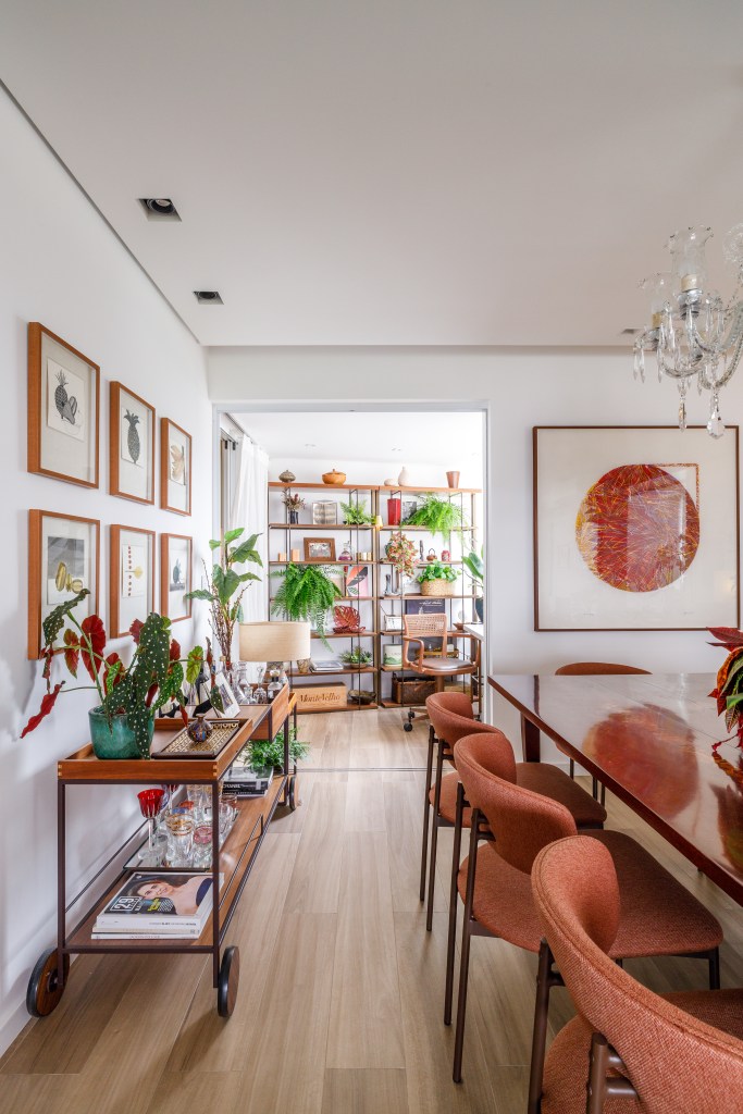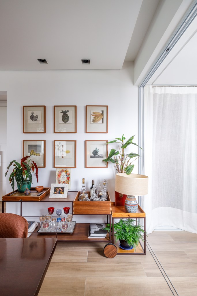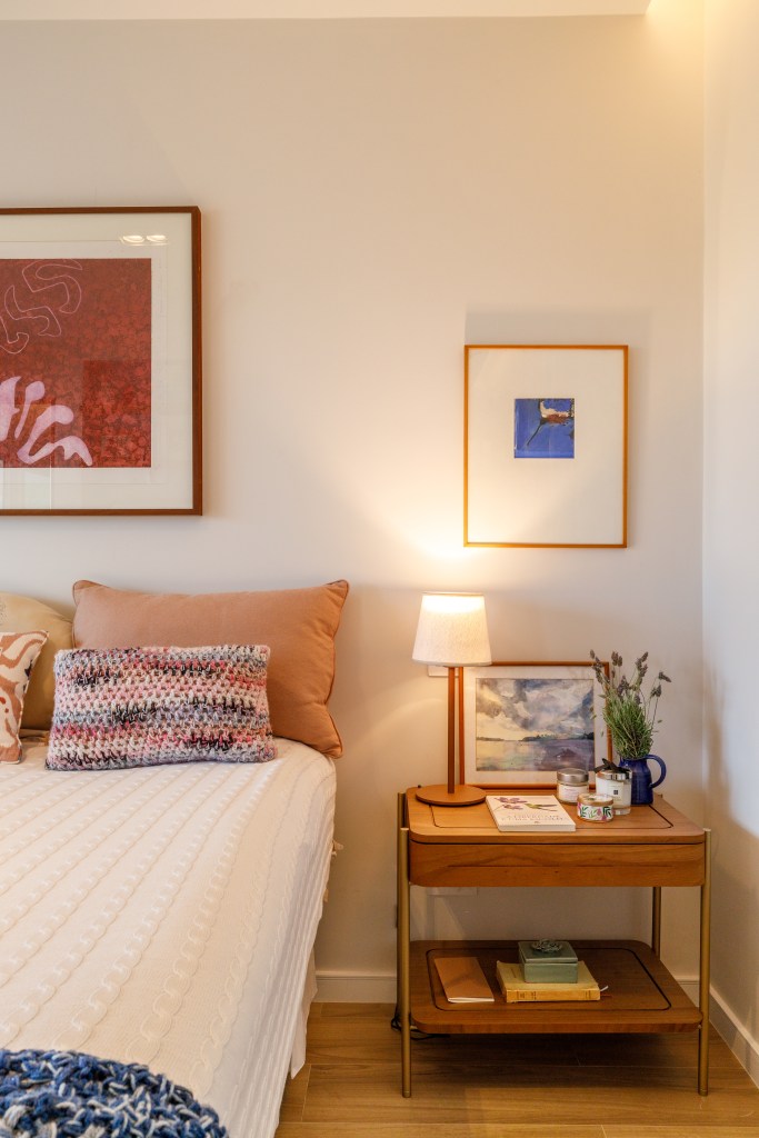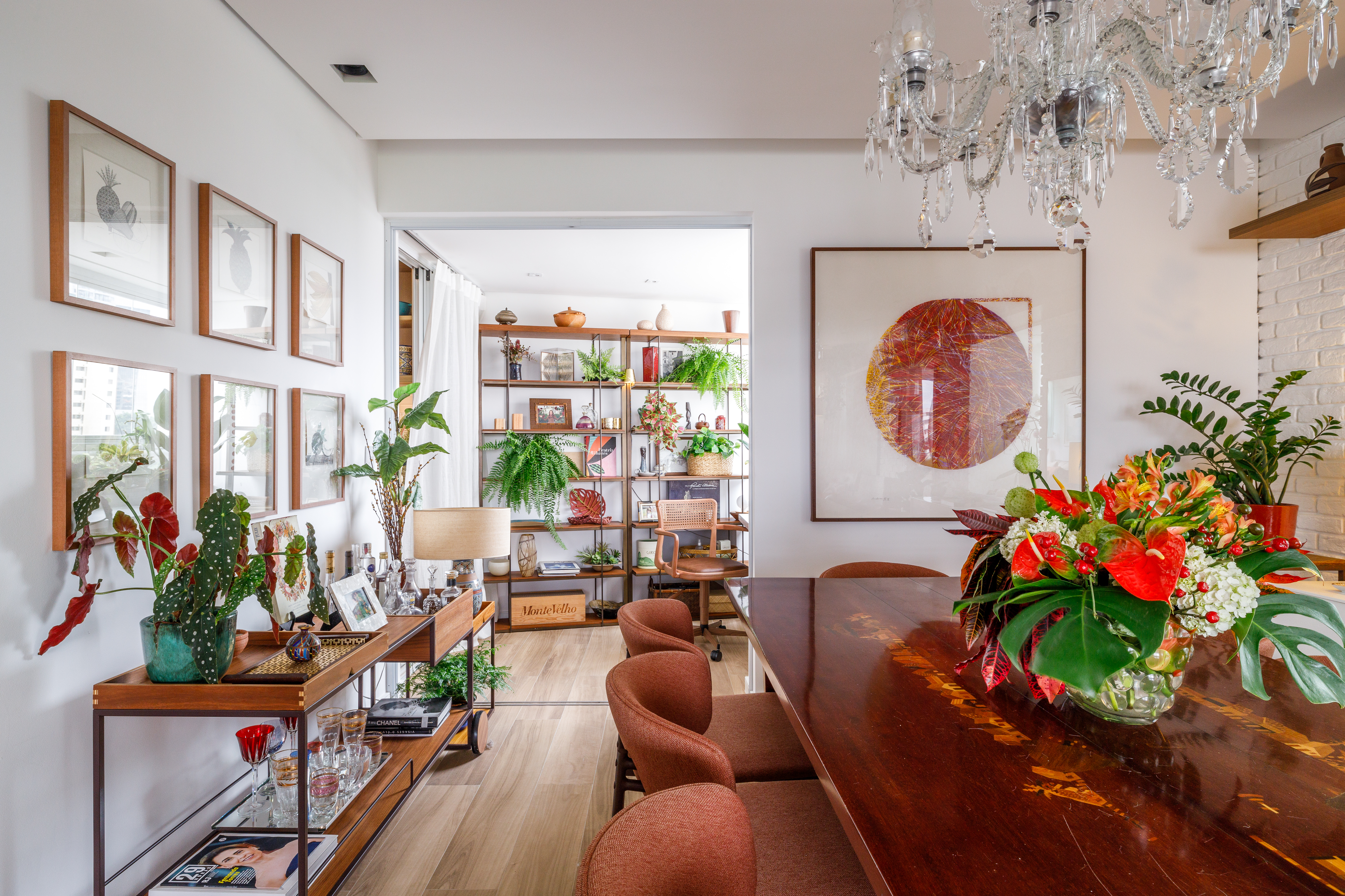 Para solucionar essa questão, parte da sala de estar foi transformada em um quarto confortável e bem iluminado para uma das filhas, uma jovem mulher. A integração desse novo dormitório foi feita com a construção de uma parede de drywall, que garantiu privacidade e uma estética alinhada ao restante do apartamento. Além disso, para otimizar a dinâmica da área social, portas de correr de madeira foram instaladas, permitindo maior privacidade à sala de TV quando necessário, sem interferir na circulação e na integração dos outros espaços sociais.