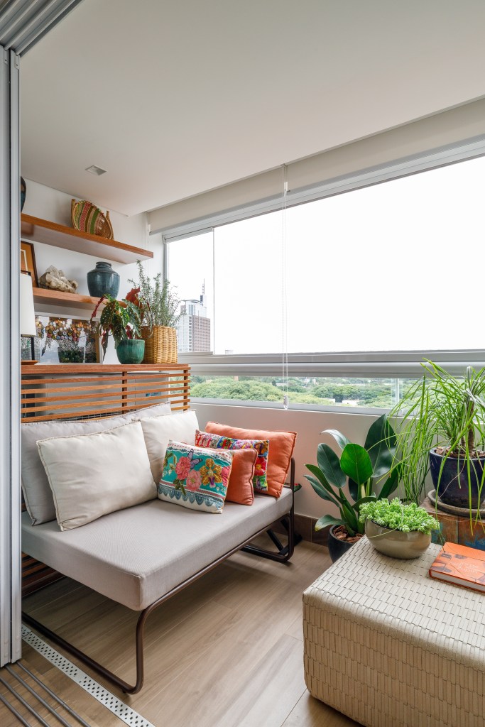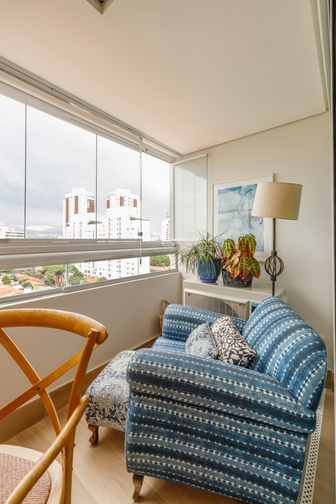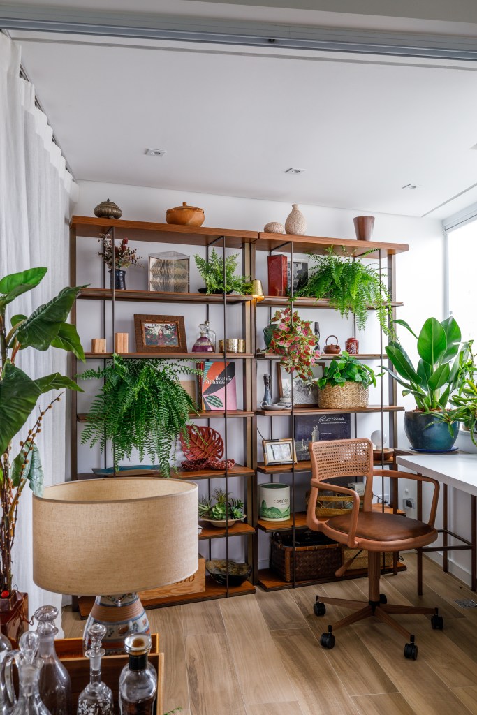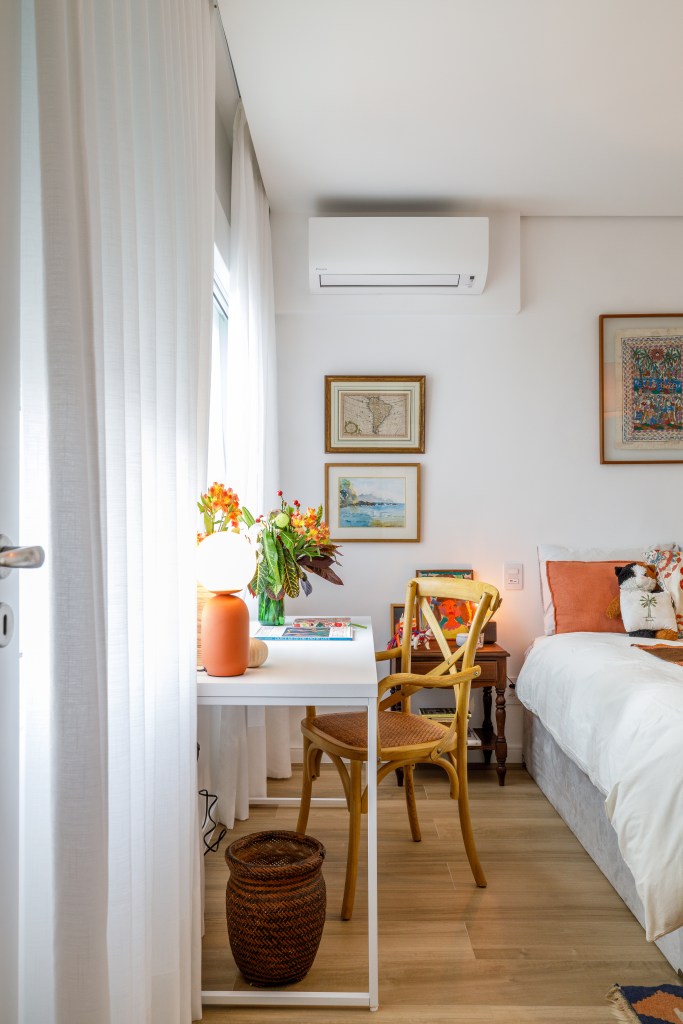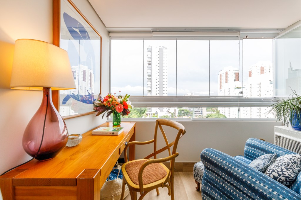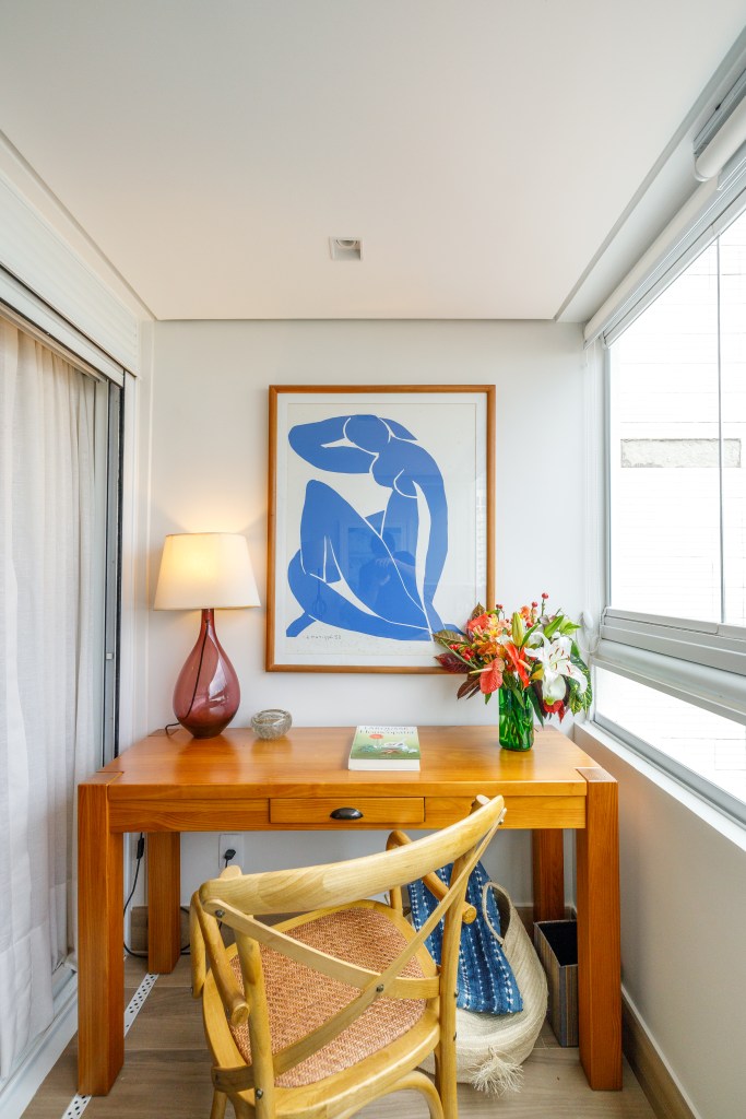 As varandas do apartamento foram adaptadas às necessidades contemporâneas, sendo transformadas em dois home offices funcionais e charmosos. Cada um foi projetado para refletir a personalidade das moradoras, oferecendo espaços adequados tanto para o trabalho quanto para os estudos.