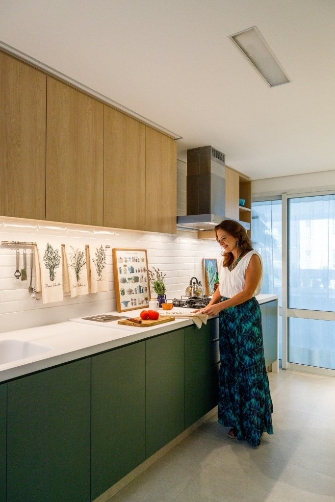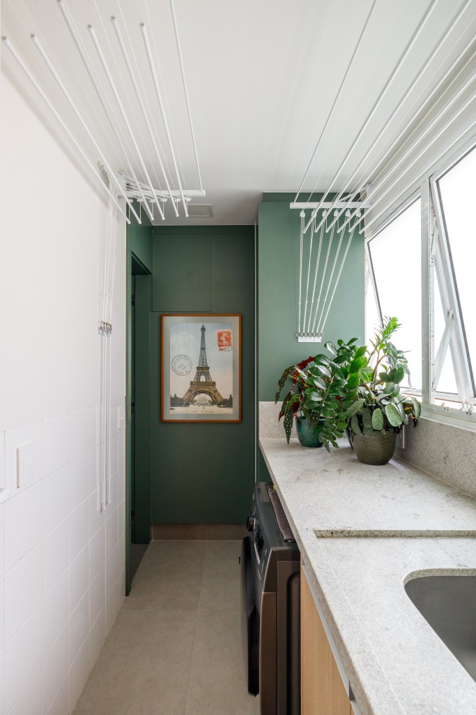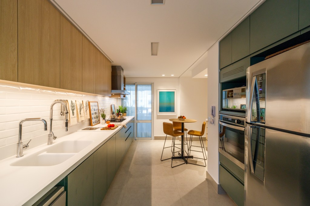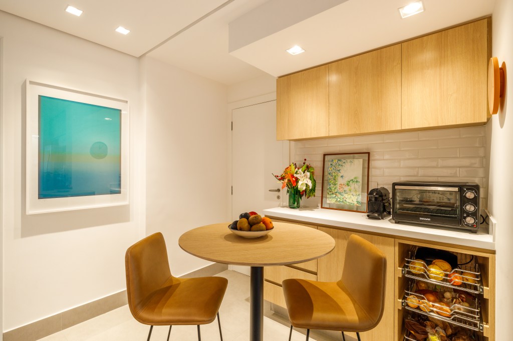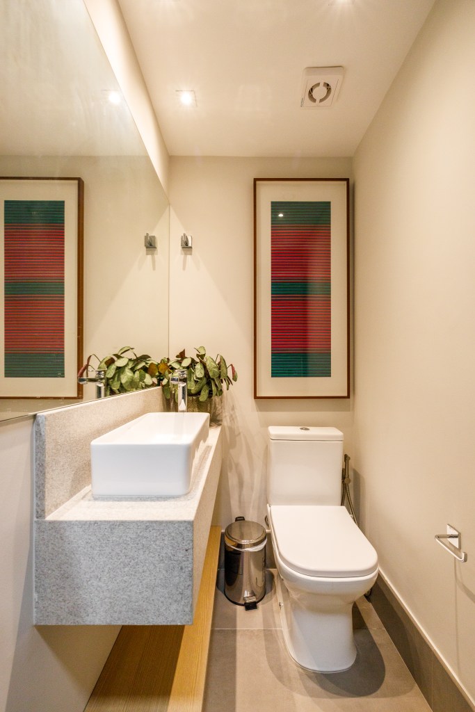 A cozinha, que antes era marcada por uma grande península central, foi redesenhada para se tornar mais prática e leve. O novo layout apresenta uma ampla bancada linear com armários planejados, otimizando o espaço e garantindo organização. Uma pequena mesa com banquetas foi incluída no projeto, ideal para refeições rápidas e momentos de descontração. A lavanderia, antes pouco aproveitada, também foi modernizada, recebendo um layout funcional e materiais resistentes que facilitam as tarefas do dia a dia. O antigo banheiro de serviço foi transformado em um segundo lavabo social elegante, com acabamentos sofisticados e iluminação planejada, pensado especialmente para atender às ocasiões de visitas e encontros familiares.