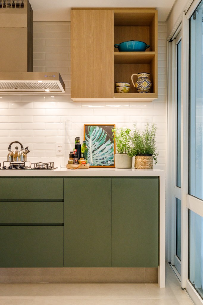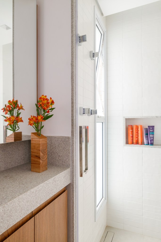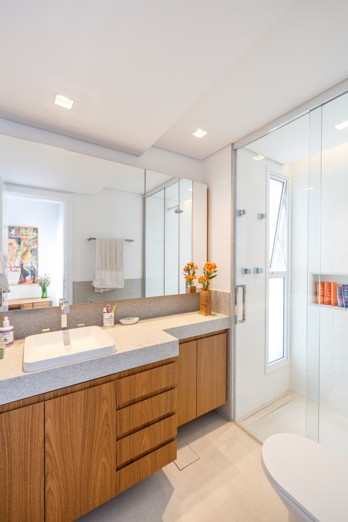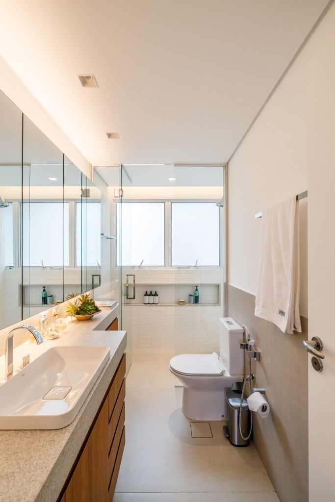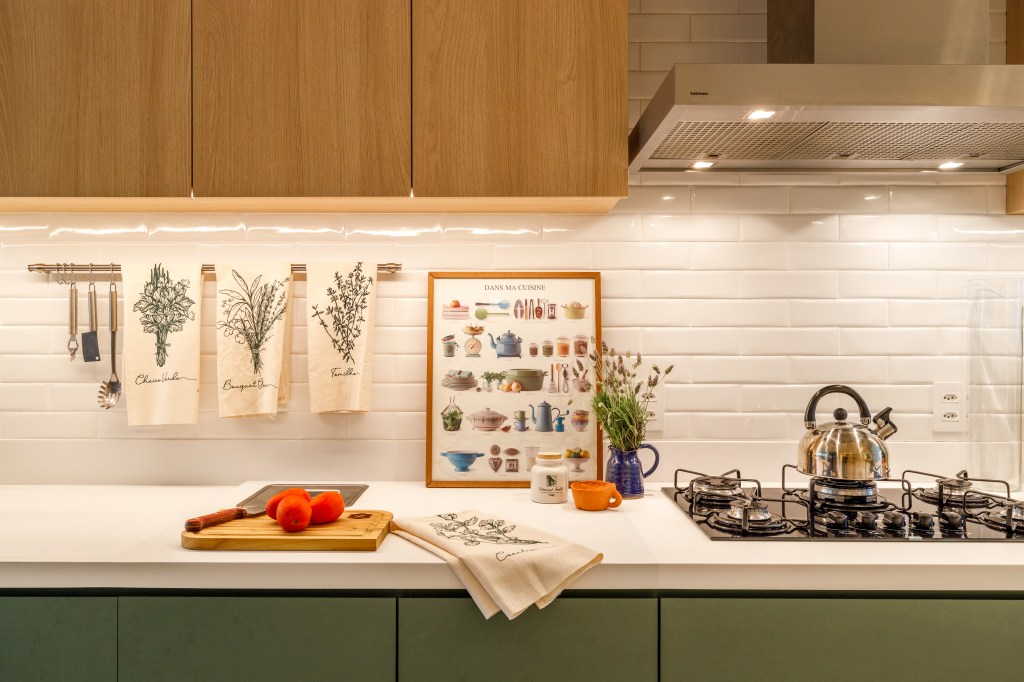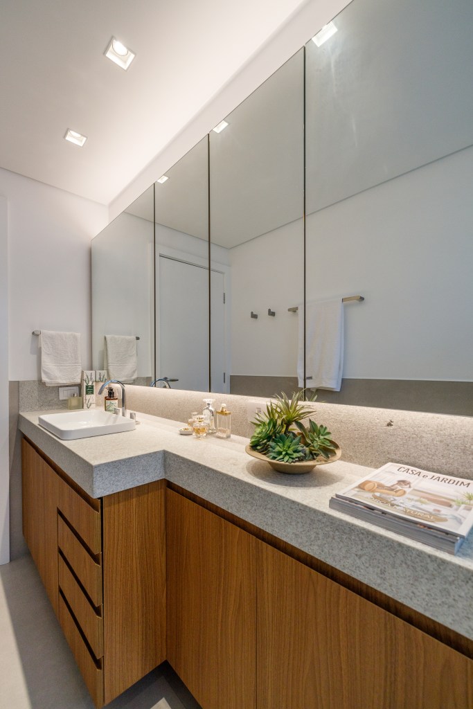 A cozinha, que antes era marcada por uma grande península central, foi redesenhada para se tornar mais prática e leve. O novo layout apresenta uma ampla bancada linear com armários planejados, otimizando o espaço e garantindo organização. Uma pequena mesa com banquetas foi incluída no projeto, ideal para refeições rápidas e momentos de descontração. A lavanderia, antes pouco aproveitada, também foi modernizada, recebendo um layout funcional e materiais resistentes que facilitam as tarefas do dia a dia. O antigo banheiro de serviço foi transformado em um segundo lavabo social elegante, com acabamentos sofisticados e iluminação planejada, pensado especialmente para atender às ocasiões de visitas e encontros familiares.