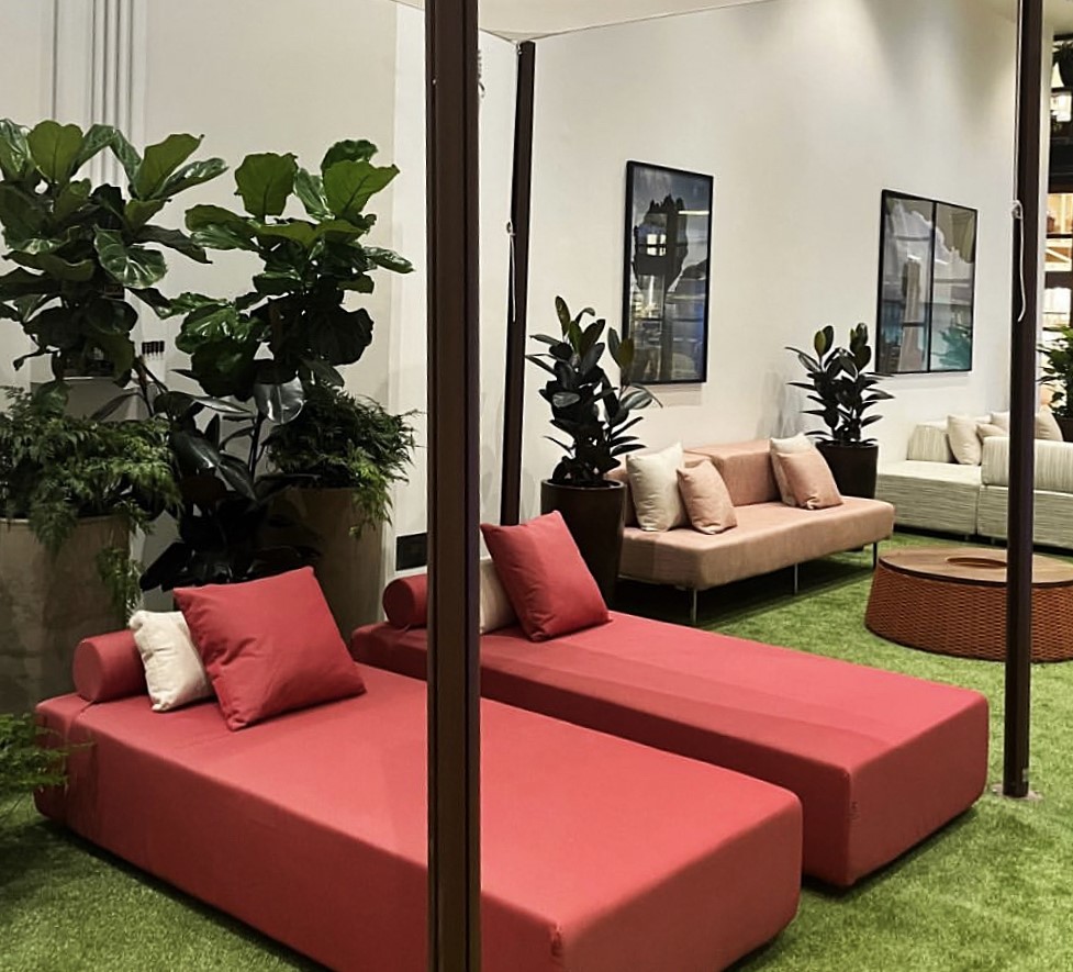 O espaço foi dividido em cinco ambientes cuidadosamente planejados para explorar a funcionalidade e a estética. A área de Garden contará com grama sintética aplicada sobre o piso existente, compondo um ambiente acolhedor, complementado por uma parede de drywall pintada e cachepots com bambus artificiais posicionados atrás do sofá.