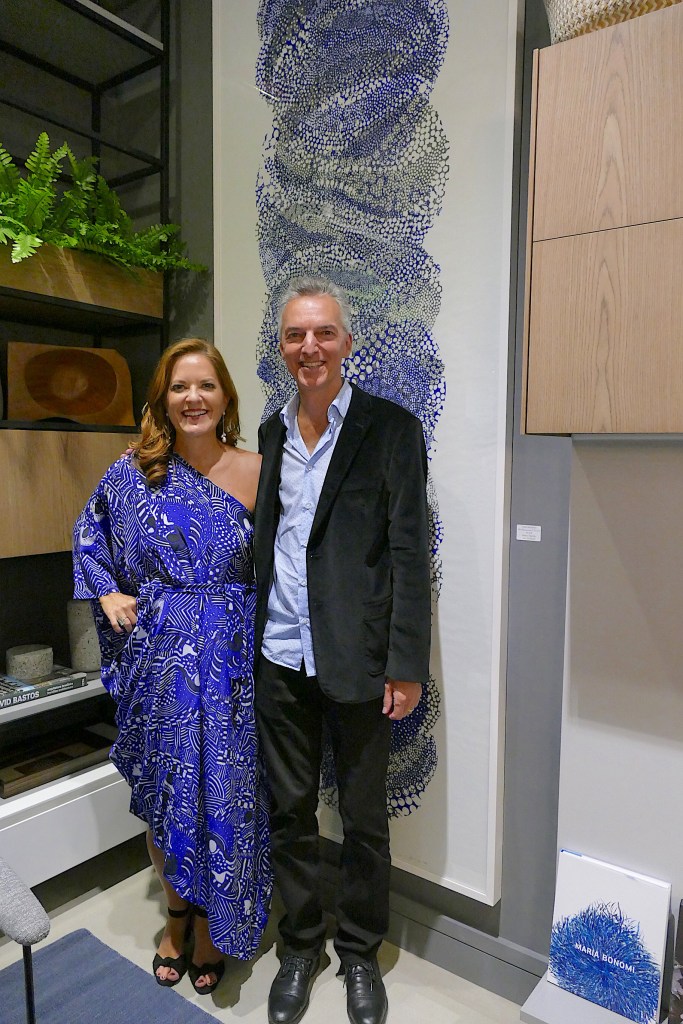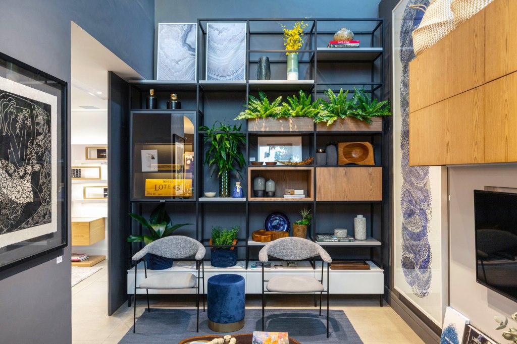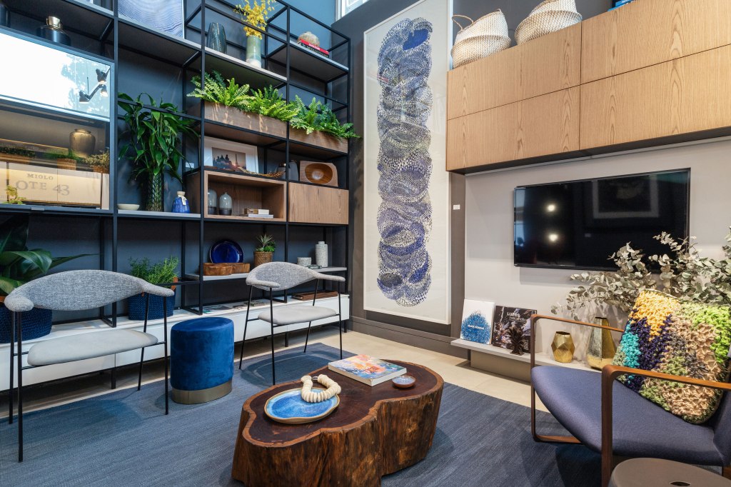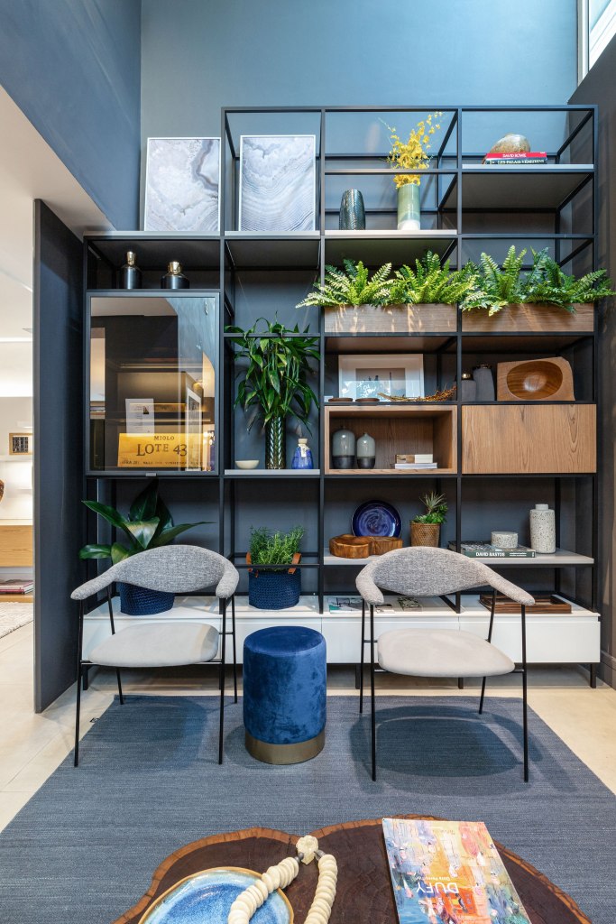 Nesta mostra, procuramos criar um ambiente de loft com espaços integrados, que juntam a cozinha aberta com uma mesa de jantar acoplada e uma área de lounge com TV e uma estante com design super atual para objetos.