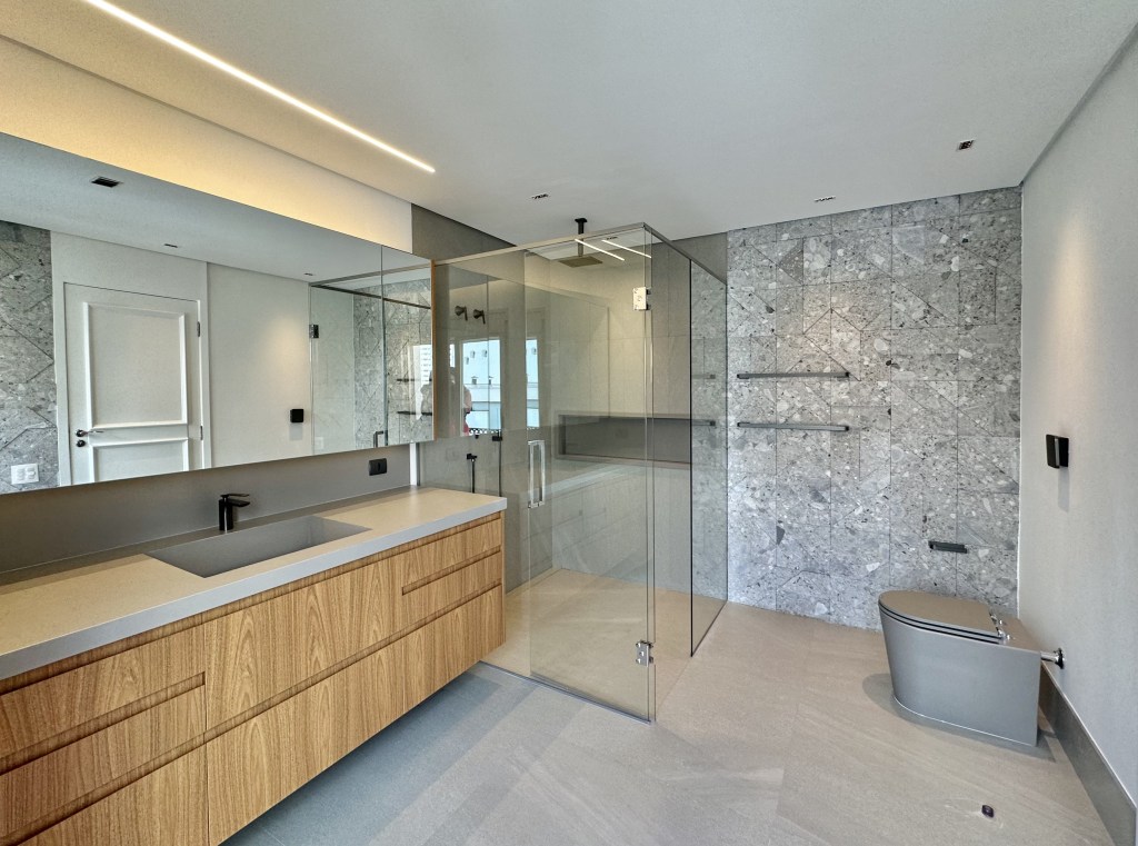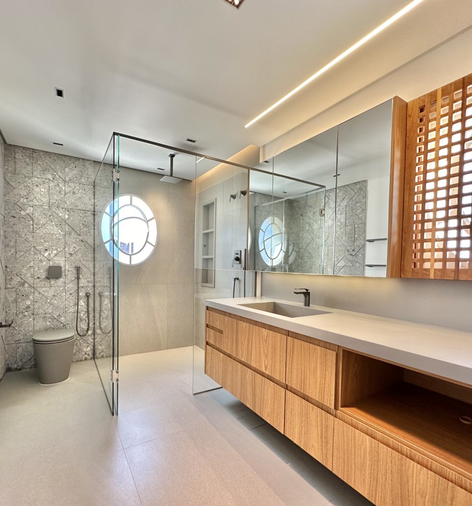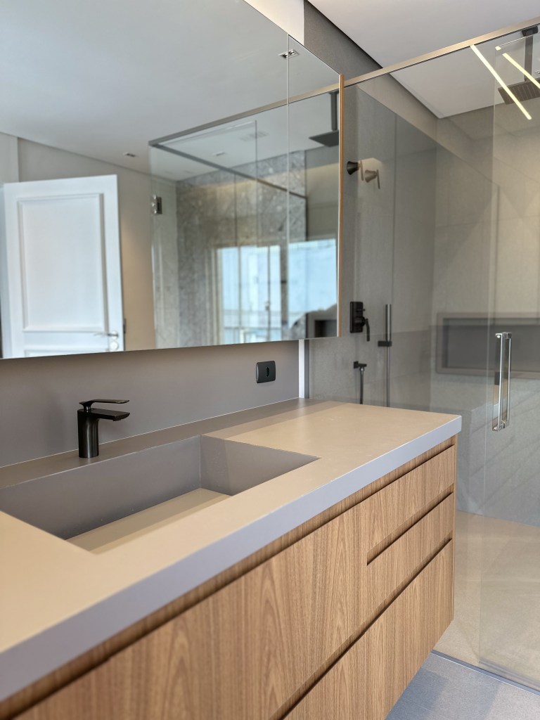O resultado final é um espaço de banho exclusivo e luxuoso, que segue a linha estética e de funcionalidade do restante do apartamento, criando uma suíte master verdadeiramente única.