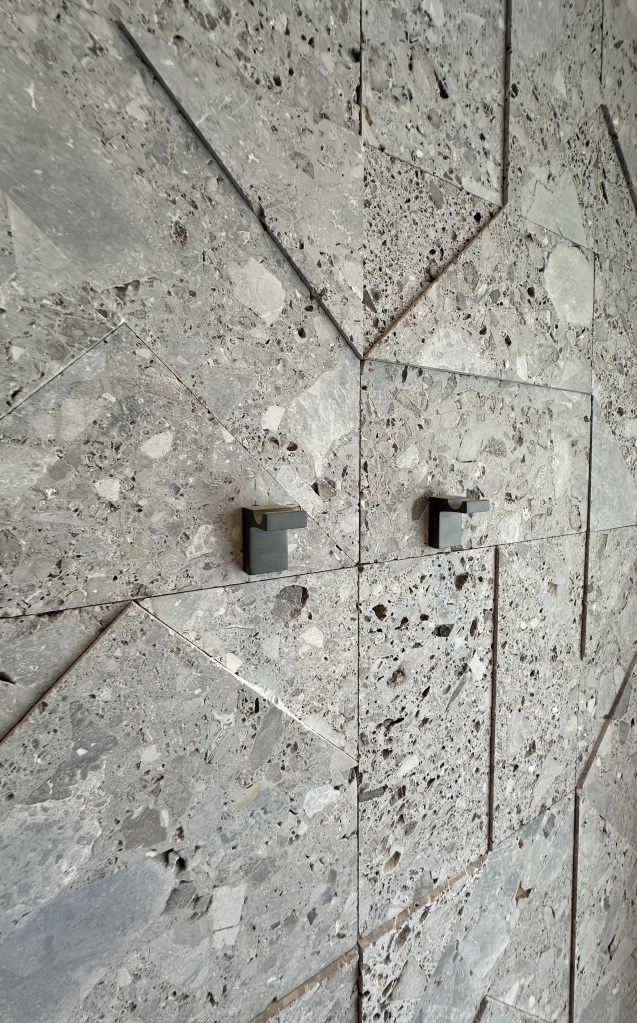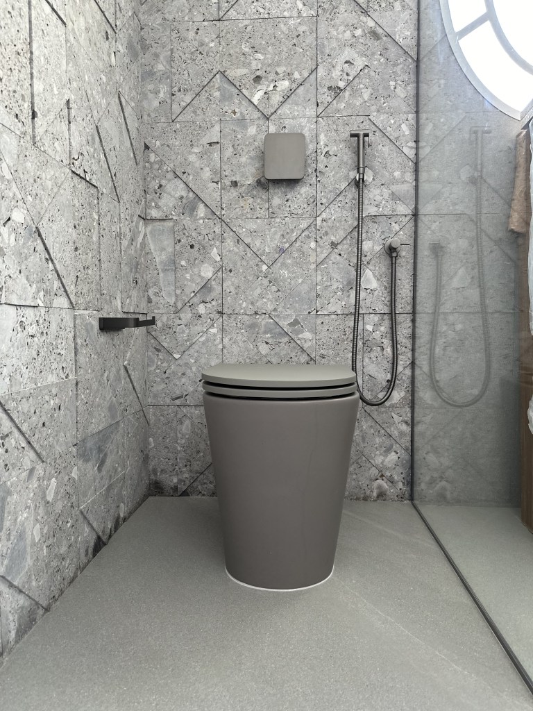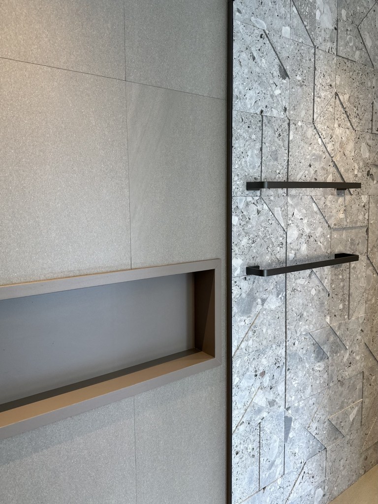 As paredes foram revestidas com pedras de desenhos geométricos, da Mosarte, criando uma textura única e sofisticada. A banheira solta, posicionada sobre um deck de madeira maciça, foi recuada para manter a passagem livre entre os banhos, reforçando a fluidez do ambiente. A escolha de madeira e tons de cinza continuou como linha condutora da arquitetura, com porcelanato de grandes formatos (NPK Mármores) no piso e nos boxes e revestimentos de pedra aplicados em pontos estratégicos.
