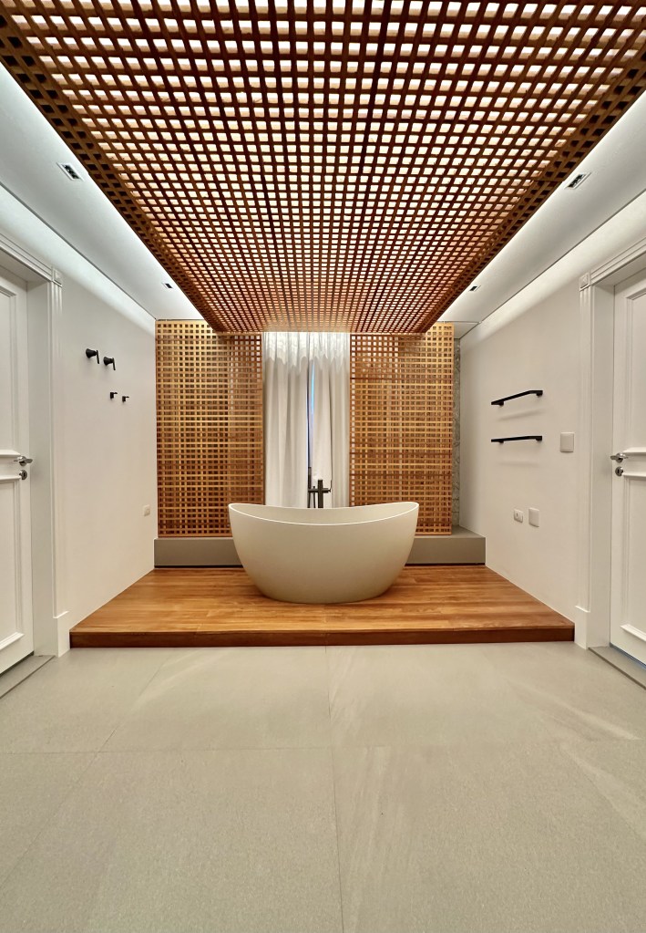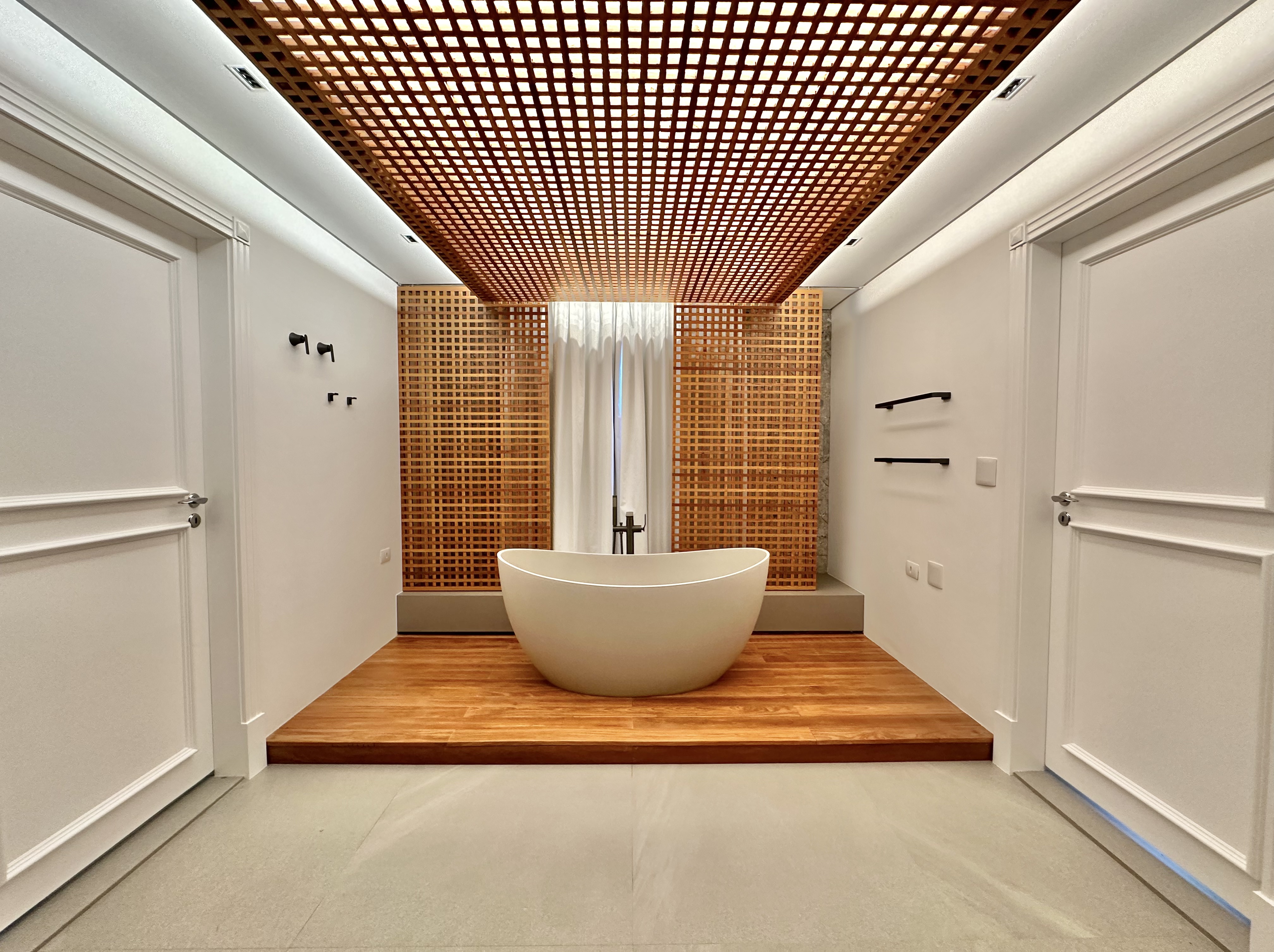 Para os banhos, a ideia foi criar um ambiente de destaque, imponente, com uma sala de spa que se abre para a cama e entre os dois banhos, o do senhor e da senhora. Para isso, foi construída uma estrutura em formato de pórtico, feita com painéis de madeira tipo colmeia (KM Marcenaria) que trazem leveza ao ambiente, enquanto a iluminação difusa (Officelux) cria uma atmosfera aconchegante e sofisticada. Na frente da janela, portas de correr no mesmo estilo foram instaladas, harmonizando com o restante do design do espaço.