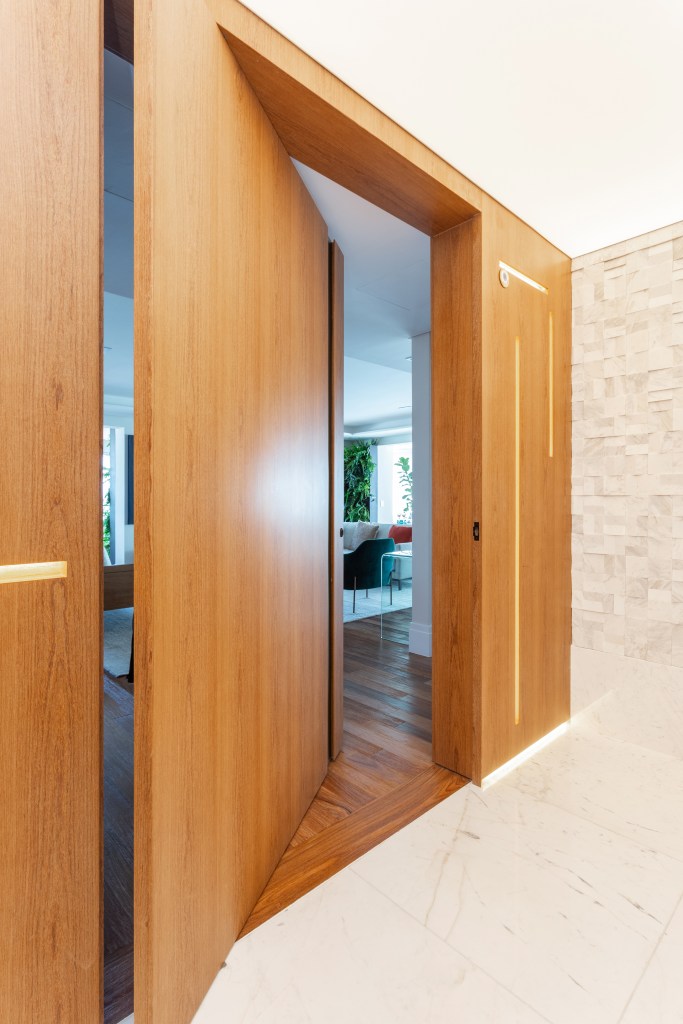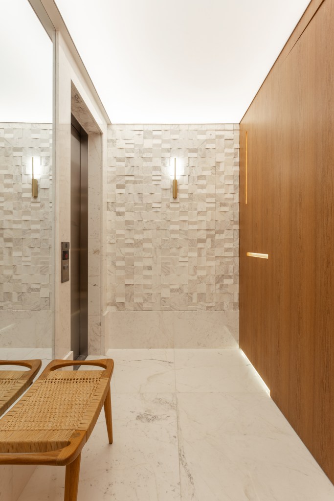 O hall de entrada foi pensado para causar impacto. Painéis com portas pivotantes e rasgos de luz emolduram o ambiente, enquanto o mármore branco Piguês no piso e os mosaicos nas paredes criam uma atmosfera sofisticada. O teto recebeu uma tela tensionada, adicionando um toque moderno e inovador.