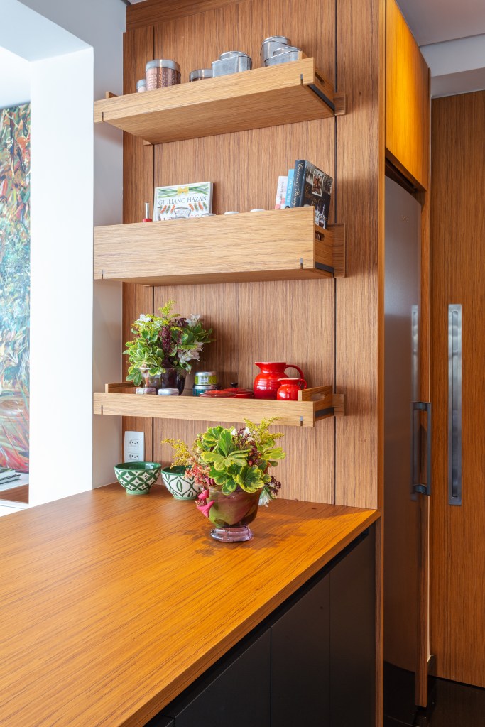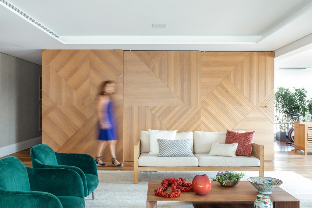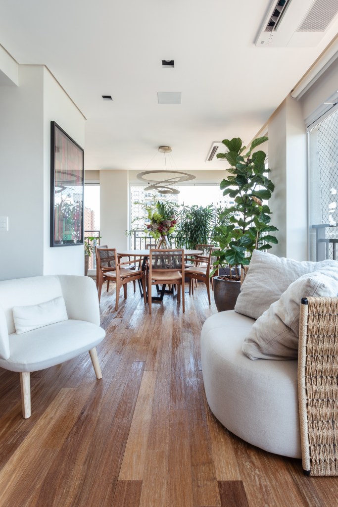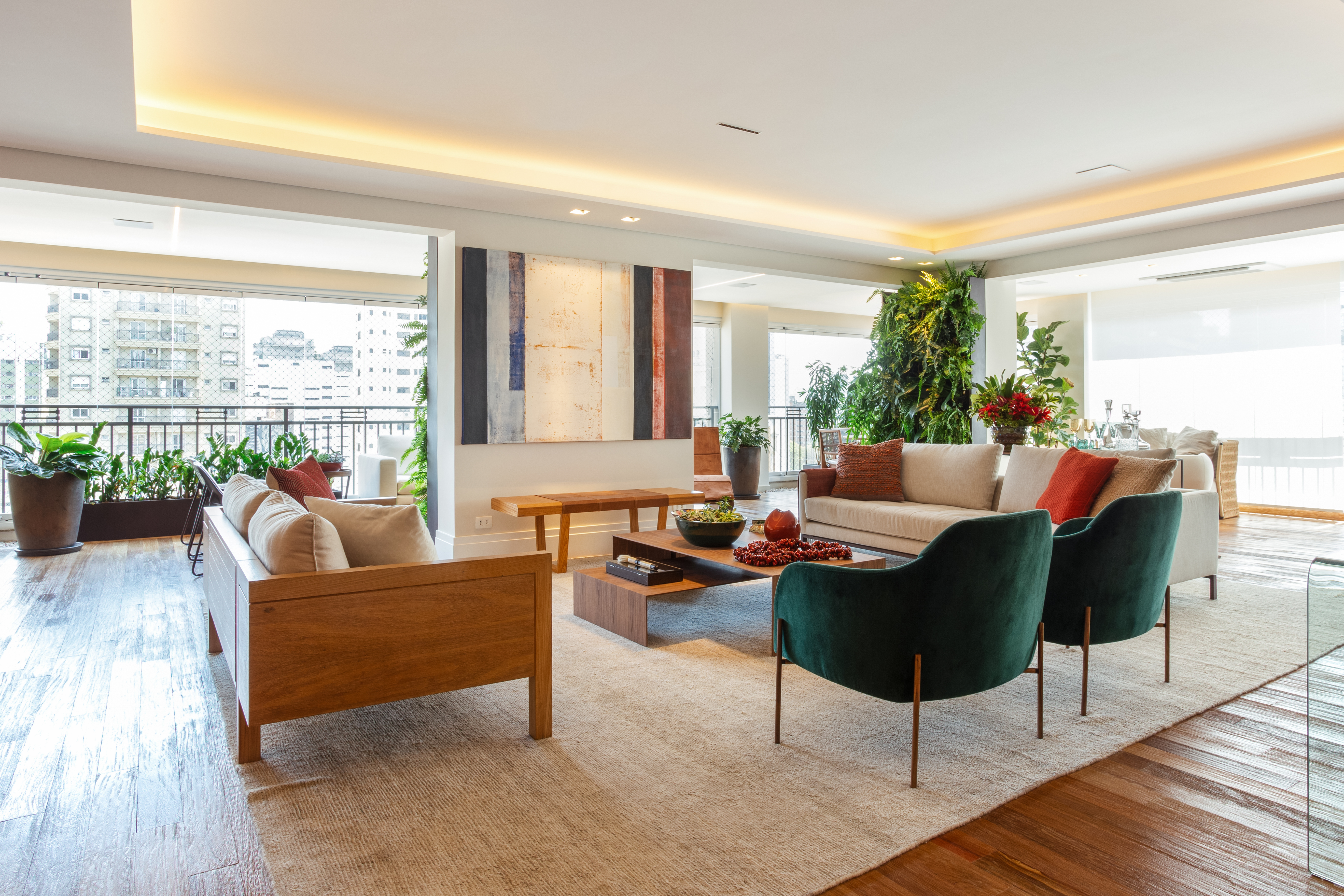 O projeto também trouxe o frescor da natureza para dentro do apartamento, com paredes verdes no living e na varanda. Este cuidado com o paisagismo trouxe bem-estar e aconchego ao espaço, que ainda conta com uma área fitness integrada à varanda, reforçando a convivência entre os moradores.