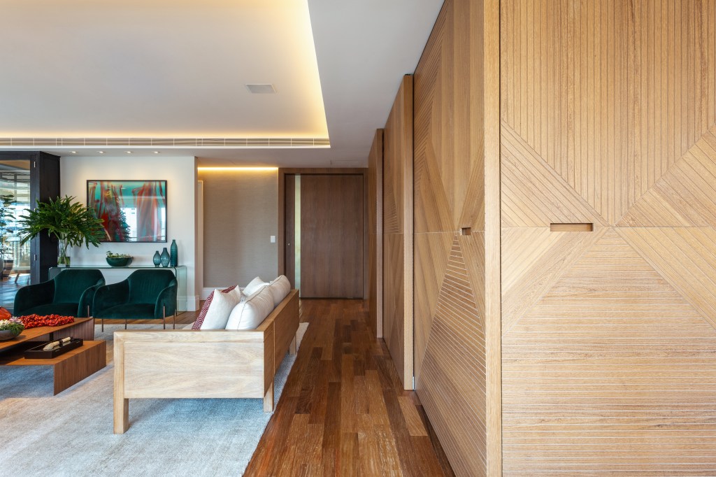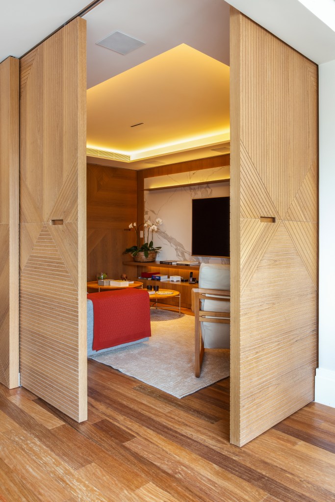 A ideia central foi integrar os espaços da área social em um grande ambiente contínuo que conectasse a varanda, o living e o home theater. Para isso, eliminamos os caixilhos e nivelamos o piso, garantindo uma transição fluida entre os espaços. O home theater foi projetado com portas de madeira de correr trabalhadas, que permitem privacidade sempre que necessário, sem comprometer a estética do conjunto.