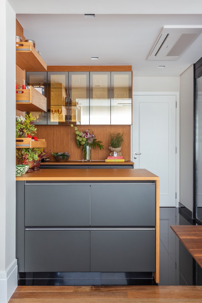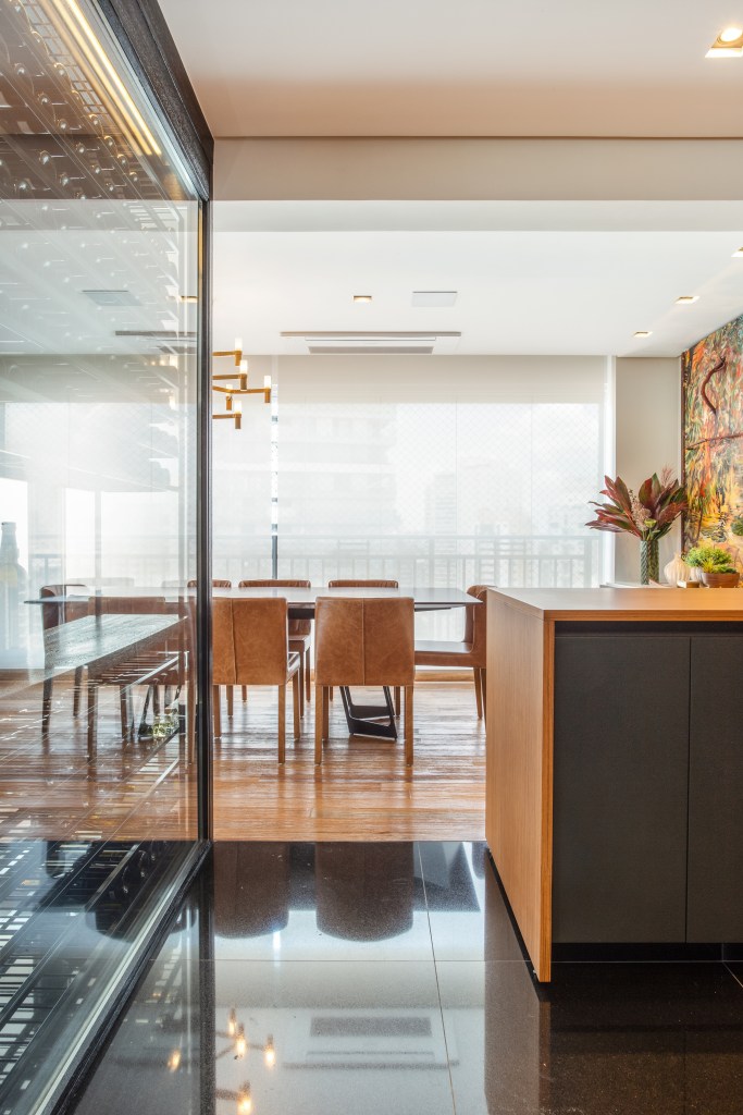 A sala de jantar foi estrategicamente posicionada na varanda, agora conectada à copa, criando um espaço acolhedor e funcional para receber. Uma adega com capacidade para 300 garrafas foi incorporada como um elemento de destaque, servindo como divisória elegante entre o living e a varanda.