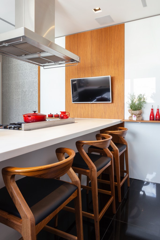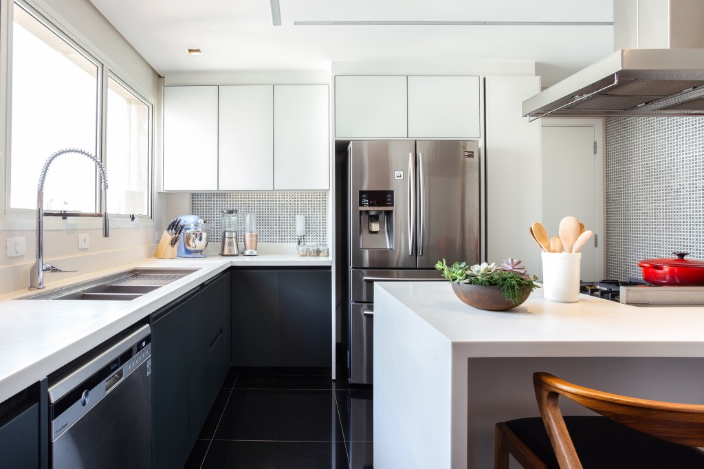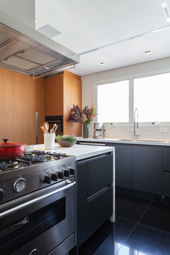 Na cozinha, o equilíbrio entre funcionalidade e design é evidente. A ilha central e as bancadas em Corian branco contrastam harmoniosamente com o piso de granito Preto Absoluto e os armários inferiores na cor Poivre, criando um espaço sofisticado e prático.